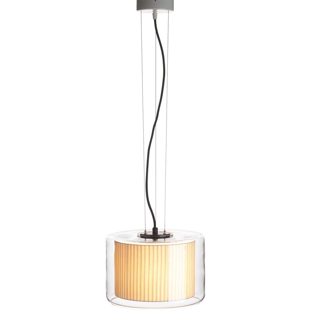 Blown glass houses a pure cotton ribboned shade for a lamp that is both classic and modern. The Mercer shade appears to float in the clear glass housing making for a light source that is as stunning and it is spectacular. The Mercer Pendant is available in 2 sizes with 2 shade colors to choose from, pleated white or pearl white. Also included are black electrical cord, suspension cable and a ceiling canopy.