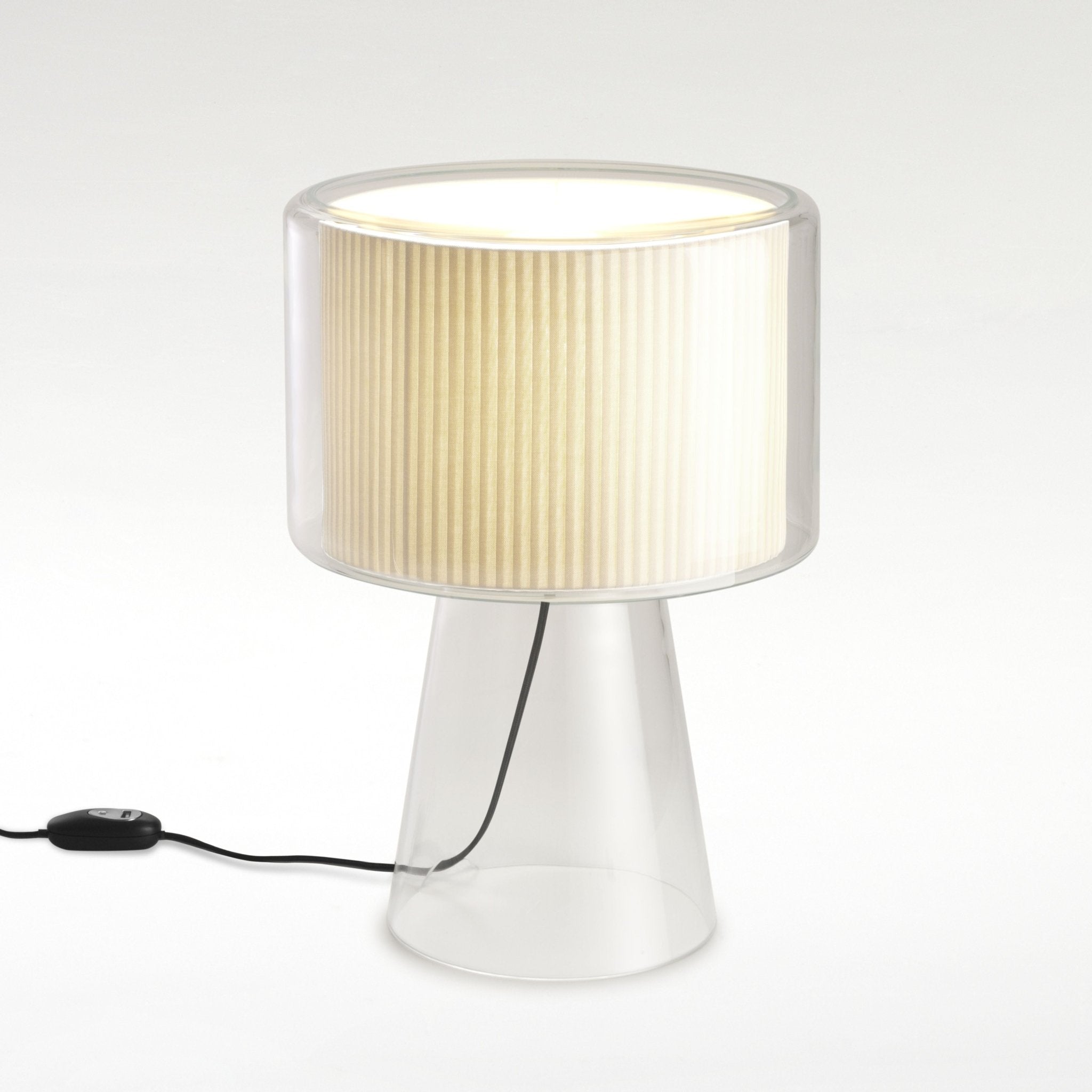 The Marset Mercer Table Lamp - Medium blends classic charm with a modern touch. Its clear blown-glass body surrounds a cotton shade that appears to float, creating soft, ambient light. As a result, this piece adds elegance to any space. The Marset Mercer Table Lamp – Large complements modern furniture and fits seamlessly into both traditional and contemporary rooms.