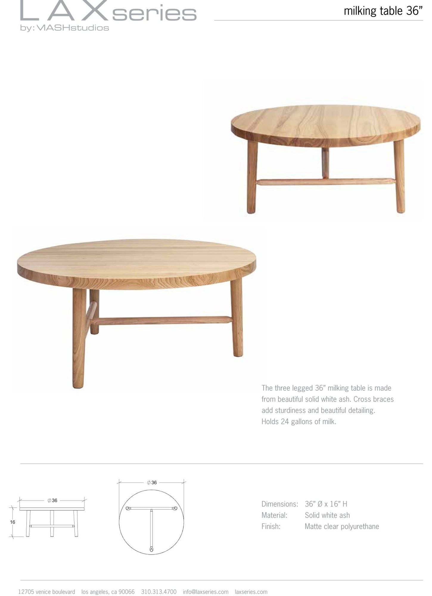 The MASH Studios Milking Table LAX Series - 36"Dia brings a modern touch to any room. Its three-legged design and compact form make it an ideal addition to your living room furniture. The table’s simplicity blends seamlessly with various scandinavian designs or contemporary setups. Pair it with the Milking Stool for a complete, stylish look that complements any interior.