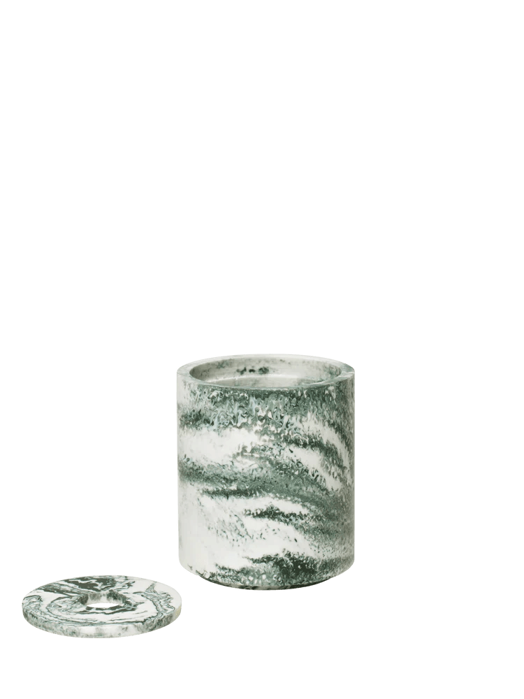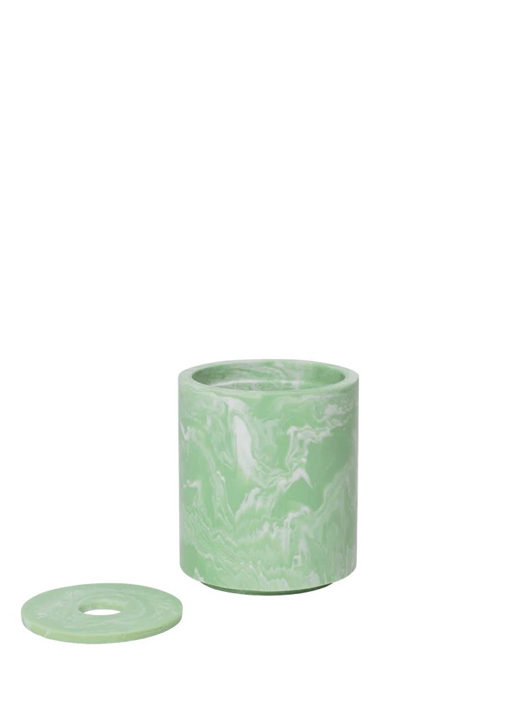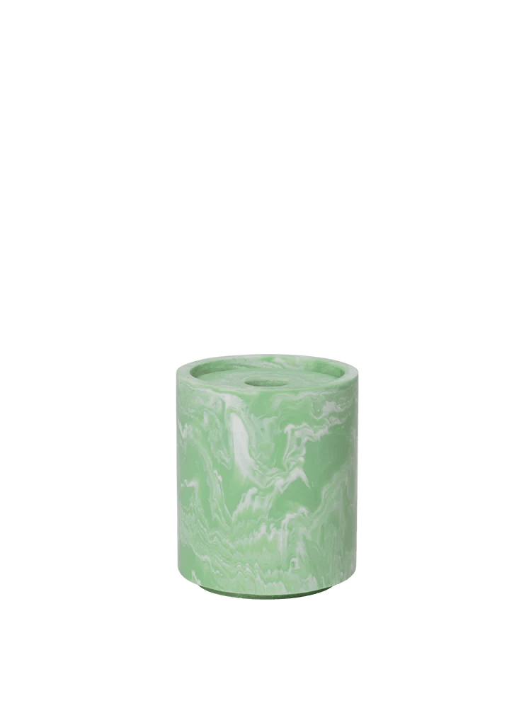 The Ferm Living Mist Container is a sleek, round storage solution designed to keep Q-tips neatly organized. Crafted from marbled resin, it offers a balance of durability and elegance, making it a refined addition to any bathroom. The Mist Container features a minimalist design inspired by the geometric aesthetic of the Mist Series. Its smooth, stackable form enhances space efficiency while maintaining a sophisticated appearance.