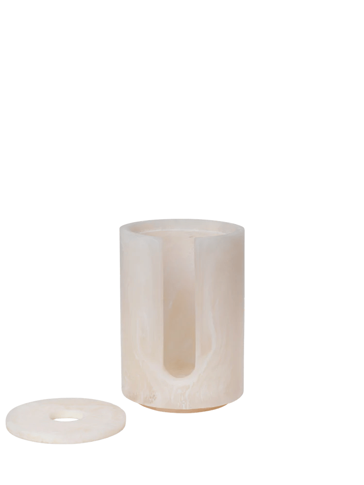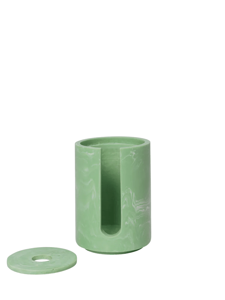 The Ferm Living Mist Cotton Pad Holder is a sleek and practical addition to any bathroom. Designed to store cotton pads, this round container offers both functionality and style. Crafted from marbled resin, it showcases a refined, airy aesthetic while ensuring durability for everyday use. The smooth, polished surface and organic patterns give each piece a unique character, making it a subtle yet elegant accent.