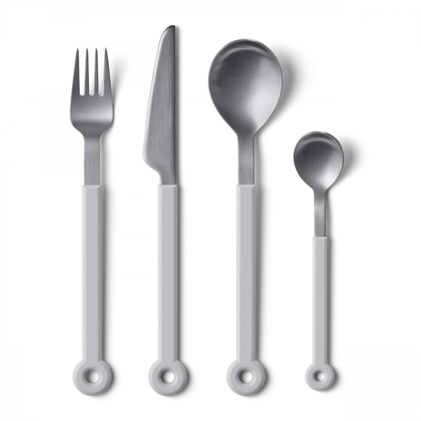 The Mono Ring White Cutlery - 4pc Set brings a contemporary touch to any dining experience. Designed by Peter Raacke in 1962, it revolutionized flatware by eliminating the need for a drawer. Instead, the set is displayed on a cross-shaped rack at the center of the table, inviting guests to help themselves. This innovative design encourages a more communal and relaxed atmosphere, breaking away from traditional dining etiquette. As a result, it fosters a sense of engagement, making every meal more interactive and enjoyable for everyone at the table.