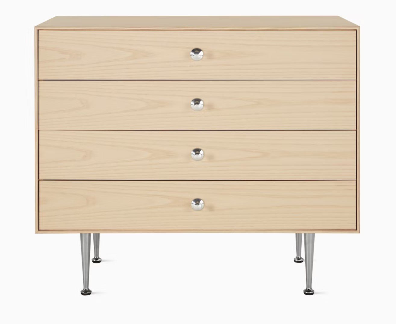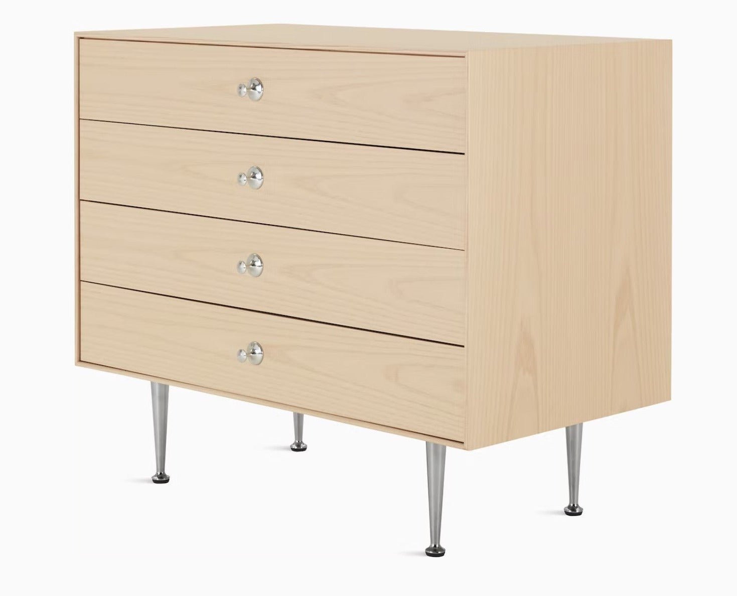 A timeless expression of fine woodcraft, the Nelson® Thin Edge 4-Drawer Chest (1952) is also exceptionally sustainable, being manufactured with 85% recycled material. This versatile unit comprises four solid-wood drawers that rest upon slim aluminum legs; the legs lift the storage several inches off the floor, giving the piece a light, airy look. Available in a choice of finishes, the Nelson® 4-Drawer Chest adds sophistication and utility to any room in your house.
