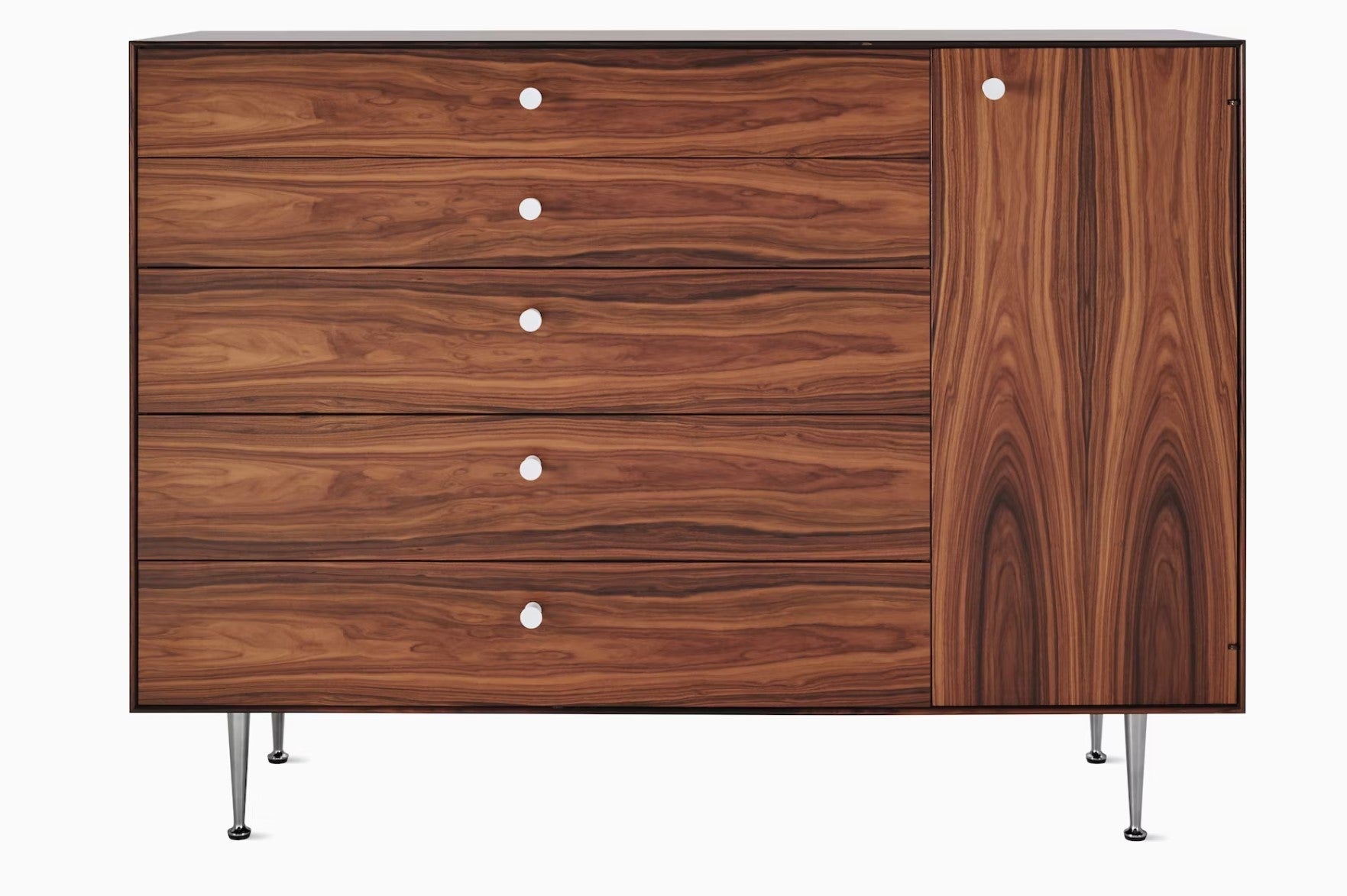 The Nelson® Thin Edge Chest Cabinet (1952) combines five wide drawers with a single-door cabinet with adjustable shelves. Keeping with George Nelson's vision of pieces that could be adapted for the times, the spacious unit is now made with sustainable veneers and 85% recycled materials; it is also offered with a choice of left or right cabinet orientation. What hasn't changed are the hallmarks of this modern narrow cabinet: its solid-wood construction and quiet beauty.