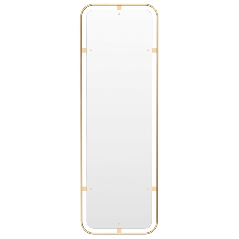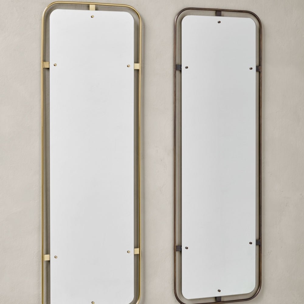 To create a refreshingly simple mirror, the Copenhagen based design studio krøyer-sætter-lassen investigated how an entire frame could surround a mirror without detracting from the beauty and reflection of the glass, almost as a museum treats its works of art in a frame. The Nimbus Mirror is simple, but its inspiration is rooted in the Gods. In Greek mythology Nimbus was a shining cloud or corona that often surrounded a deity when on Earth. Available in bronzed or polished brass and light-reflecting glass, the soothing and sophisticated round shape looks at home in virtually any space. Take in your entire profile in this long rectangular version of the Nimbus Mirror, which is also available in a round style.