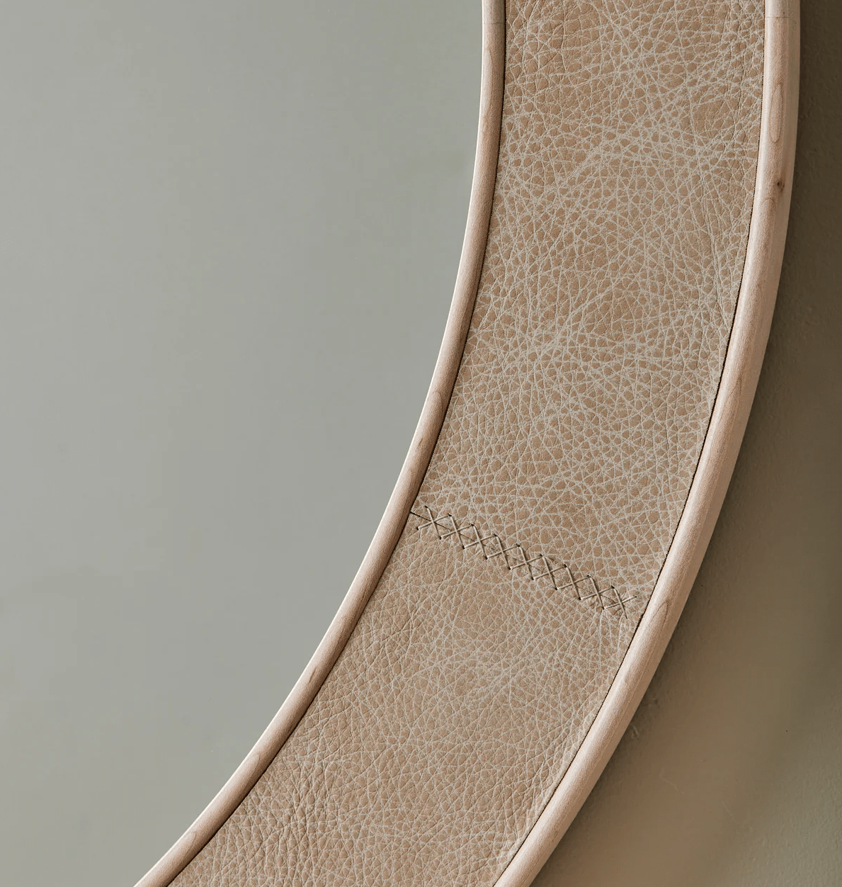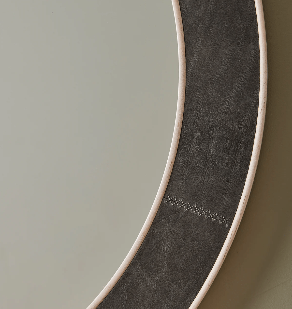 The Lostine Norse Mirror - Circle is a modern classic. Crafted from solid whitewashed maple and finished with hand-sewn leather, it blends simplicity with fine detail. Its clean circular form works beautifully above a credenza, near a lounge chair, or across from a media console. Thanks to its understated elegance, it suits both Scandinavian designs and minimalist interiors alike.