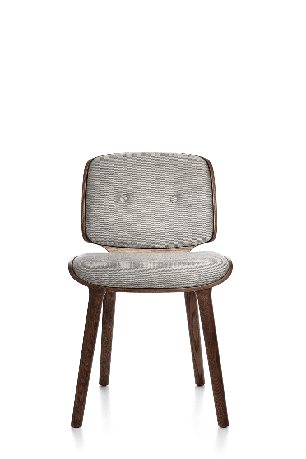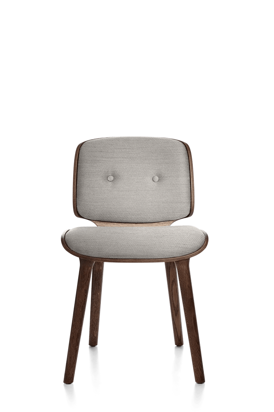 The Moooi Nut Dining Chair is Marcel Wanders' approach to making dining seating that actually wants to hug you instead of just propping you upright for meals. Part of the larger Nut collection designed back in 2013, it uses that same bent plywood construction with solid oak legs that gives the whole series its distinctive wrapped, organic shape. The curved shell cradles your back in a way that feels protective without being confining, and the cushioned seat and backrest add enough padding that you're comfortable through long dinners or working sessions at the table. Available in multiple wood stains and a wide range of upholstery fabrics, so you can match it to existing furniture or go bold with contrasting colors and textures. The solid oak legs taper nicely and keep the visual weight from getting too heavy despite the enveloping form.