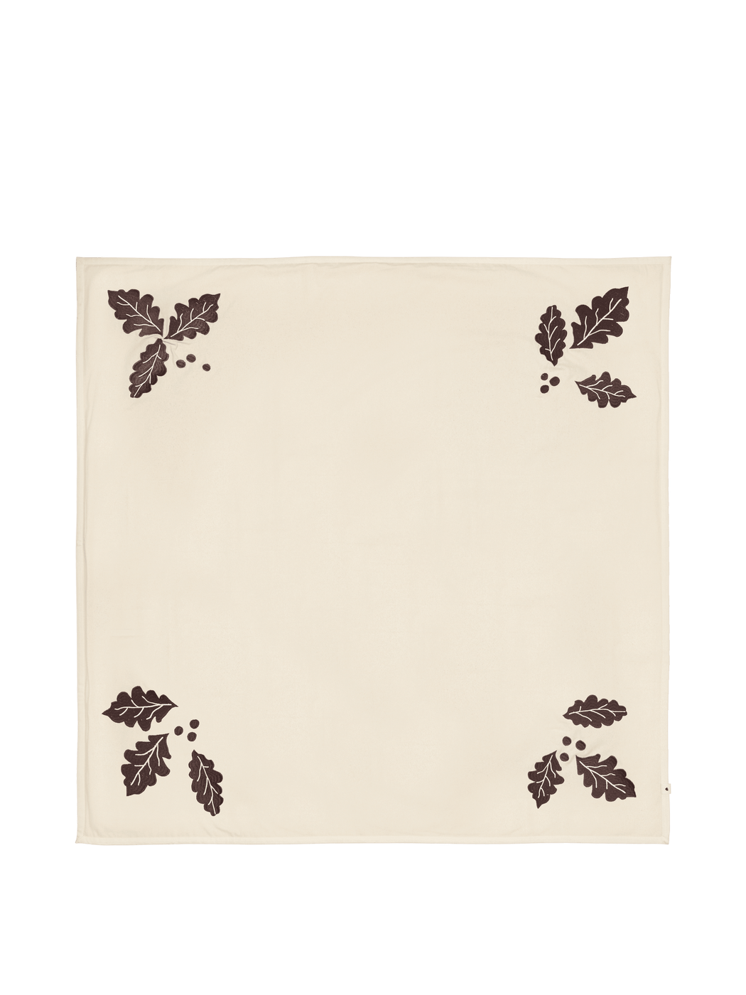Made from 100% GOTS-certified organic cotton, the Oak Christmas Tree Blanket features dense machine embroidery with a rich, tactile feel. Oak leaves and berries in a deep, dark chocolate tone adorn the corners, offering a refined contrast against the neutral base. Expertly finished with a cotton hem, its timeless square shape suits a wide range of tree sizes with effortless elegance.