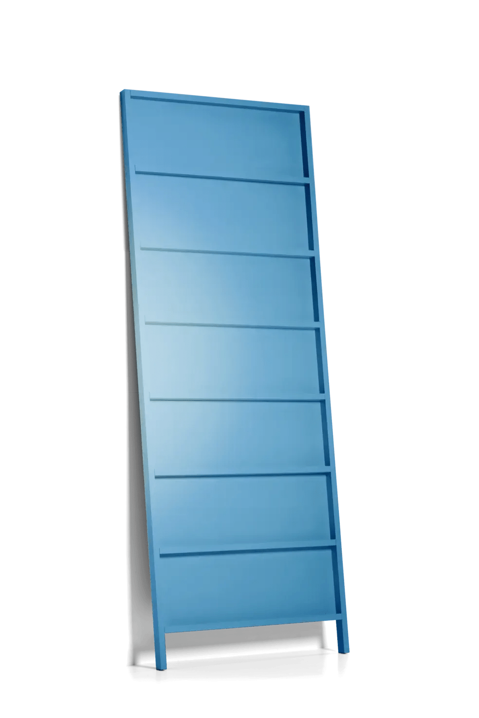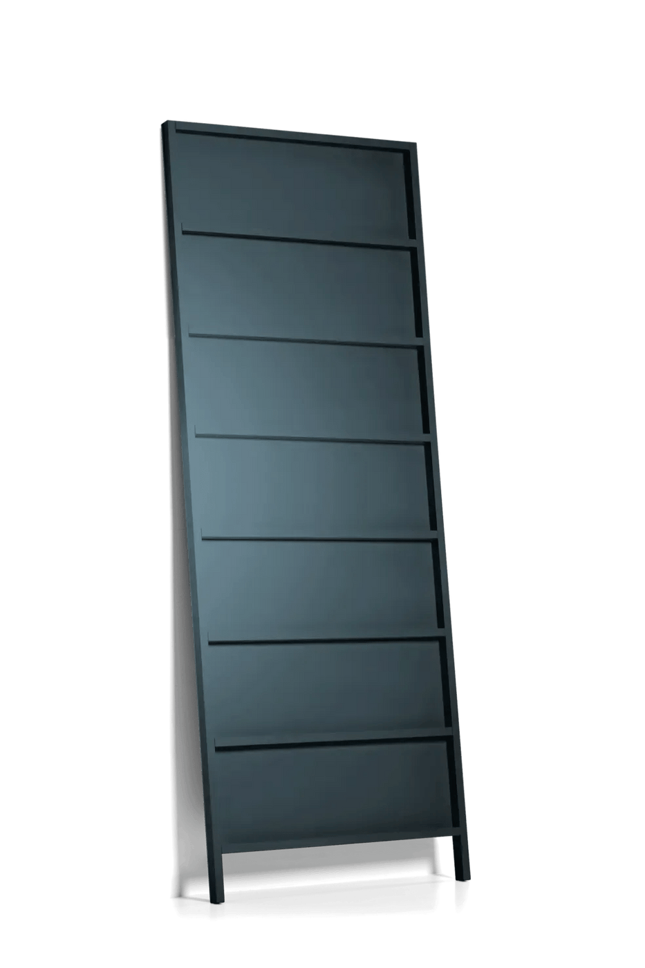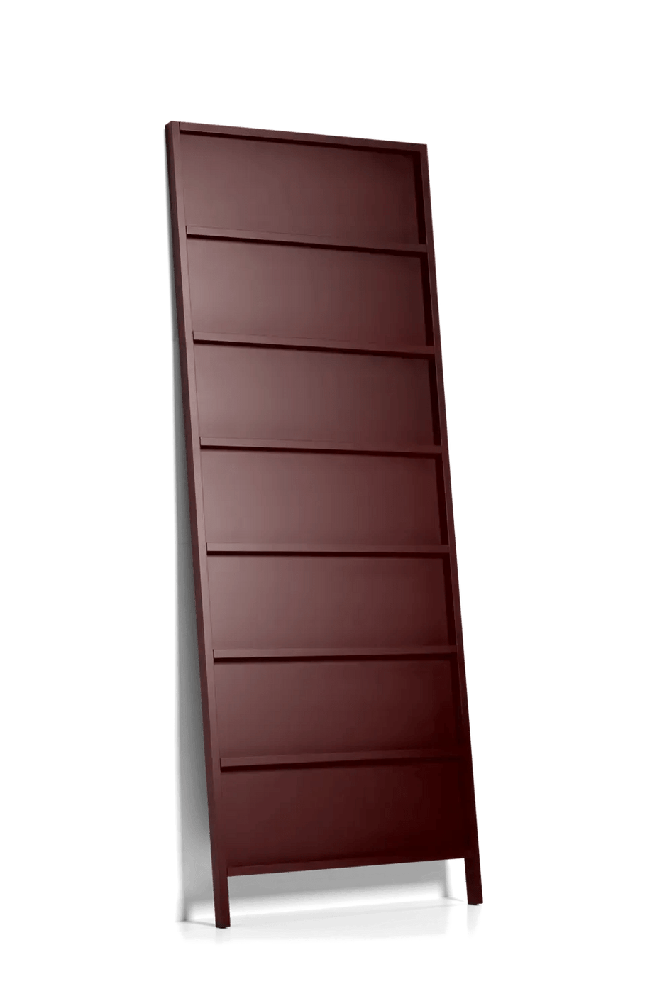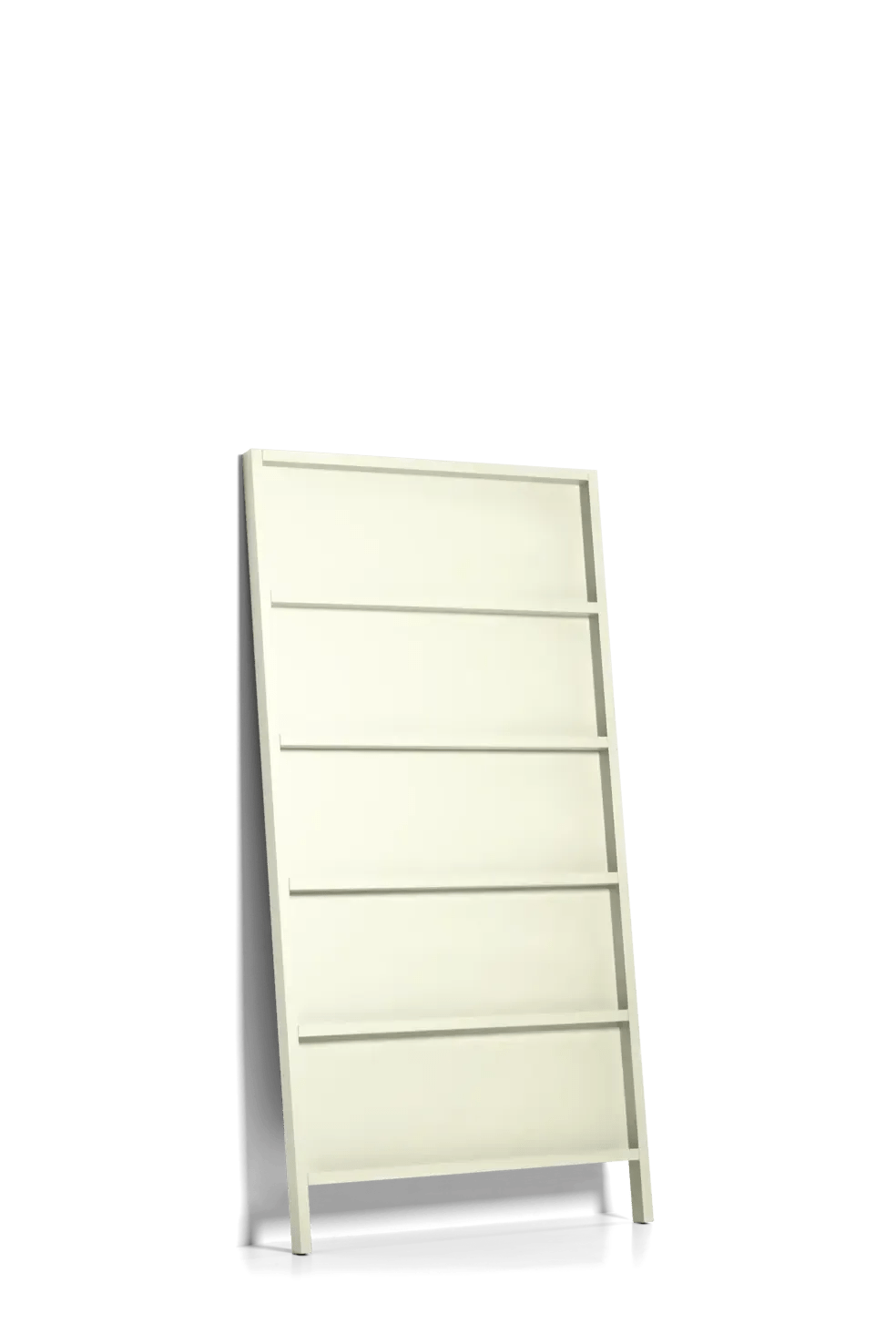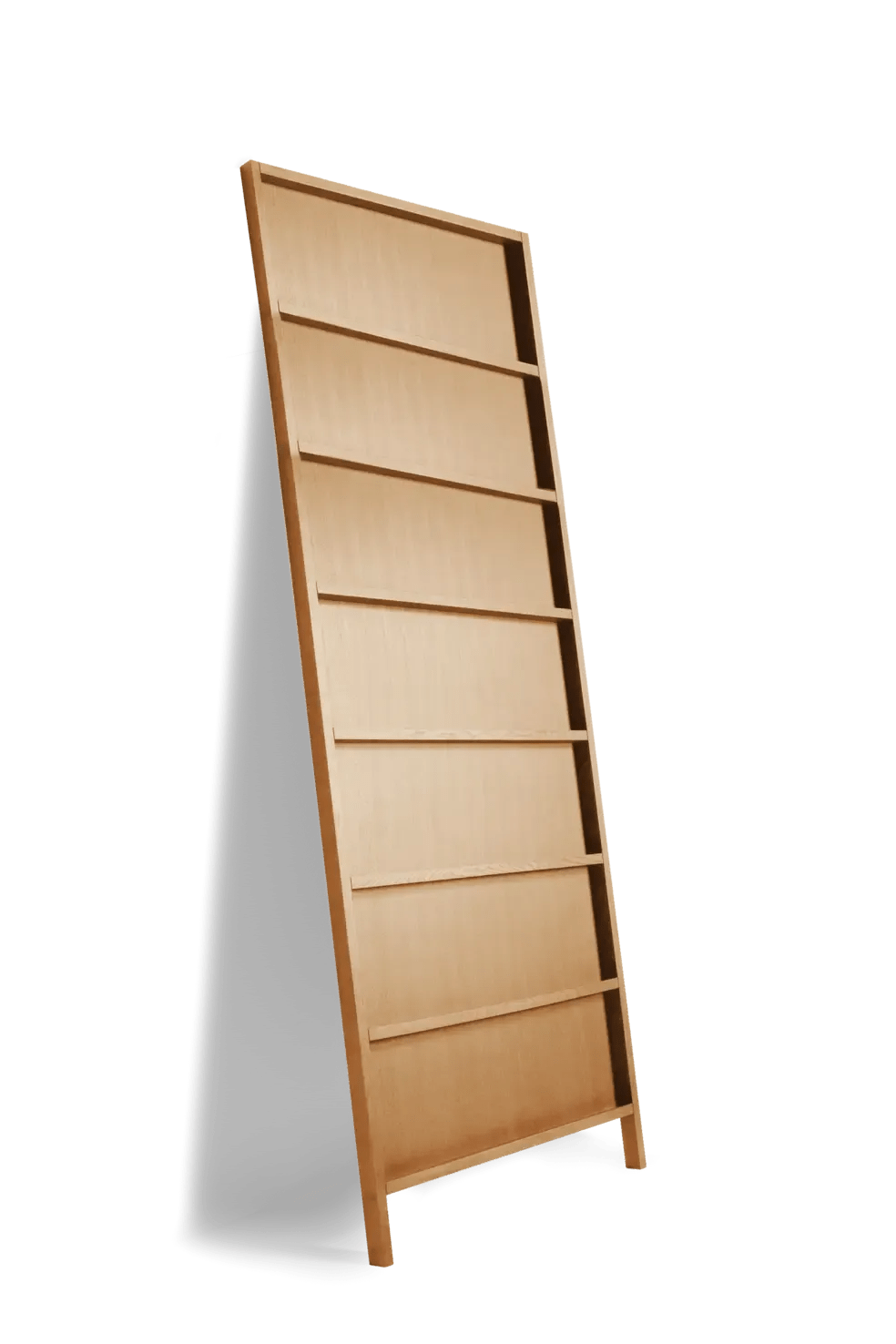 The Moooi Oblique is Marcel Wanders' solution to the problem of bookshelves taking up too much floor space - he just leaned the whole thing against the wall at an angle and called it done. Designed back in 2002, it's essentially a tall, narrow ladder-style shelf that props against your wall instead of mounting to it, which sounds precarious but works because of how the weight distribution and angle play out. The super-shallow 2.4-inch depth means this isn't for storing your hardcover collection, but it's perfect for displaying magazines, photo books, framed pictures, or creating what Wanders calls "the mood board of your lifestyle." The raised edge along each shelf stops everything from sliding off when the shelf leans back, which matters more than you'd think once you start loading it up with stuff. You can get it in solid oak with various stains or lacquered beech in a bunch of RAL colors including this traffic white, and the small version stands about 82 inches tall while the big one goes up to 112 inches.