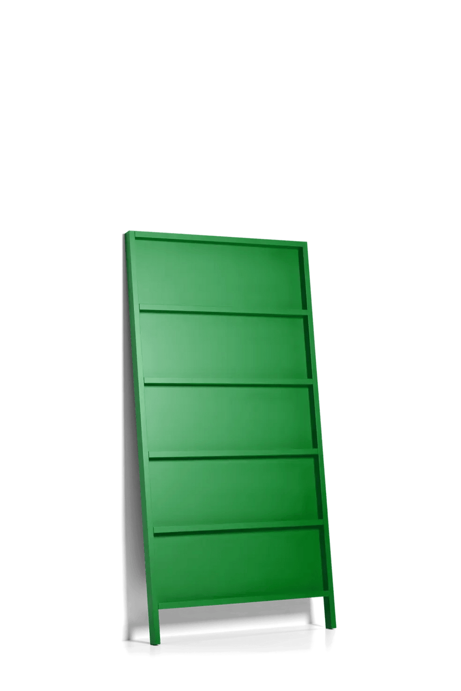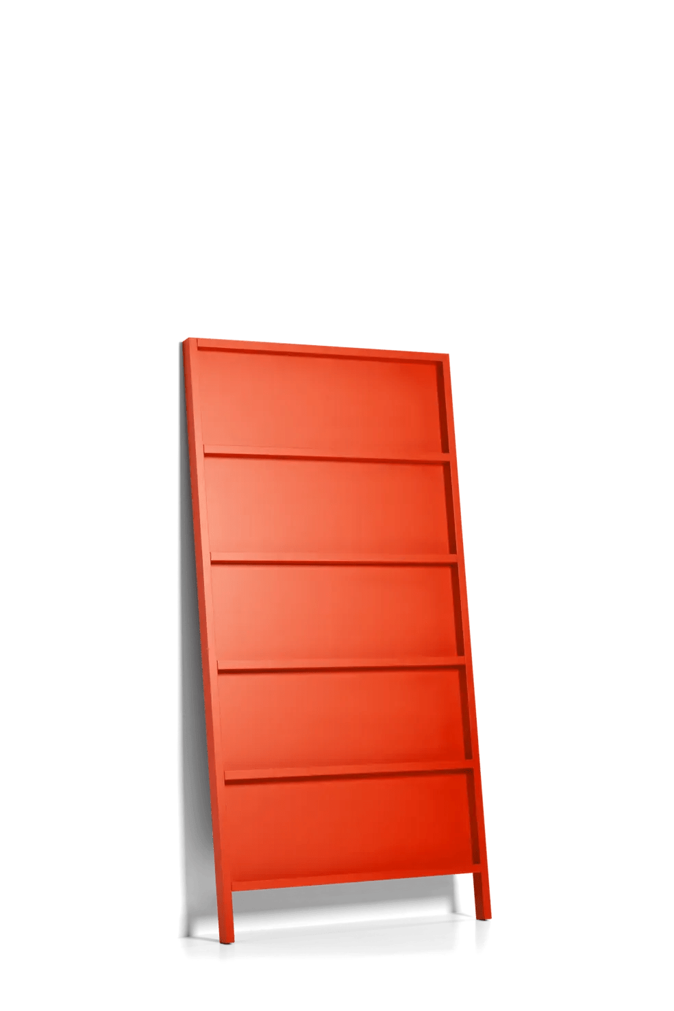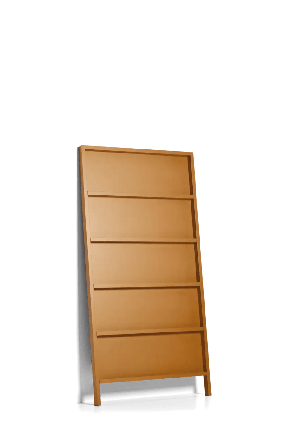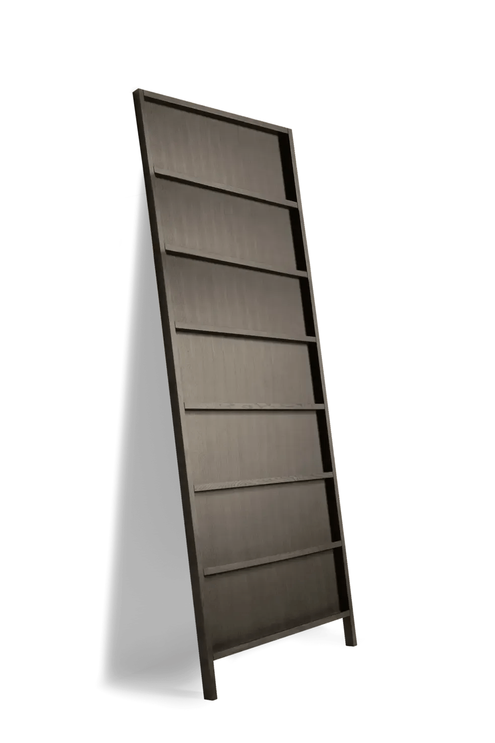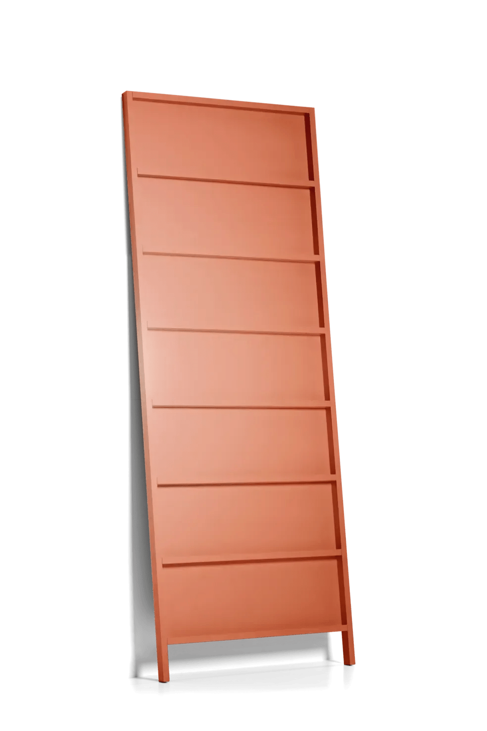 The Moooi Oblique is Marcel Wanders' solution to the problem of bookshelves taking up too much floor space - he just leaned the whole thing against the wall at an angle and called it done. Designed back in 2002, it's essentially a tall, narrow ladder-style shelf that props against your wall instead of mounting to it, which sounds precarious but works because of how the weight distribution and angle play out. The super-shallow 2.4-inch depth means this isn't for storing your hardcover collection, but it's perfect for displaying magazines, photo books, framed pictures, or creating what Wanders calls "the mood board of your lifestyle." The raised edge along each shelf stops everything from sliding off when the shelf leans back, which matters more than you'd think once you start loading it up with stuff. You can get it in solid oak with various stains or lacquered beech in a bunch of RAL colors including this traffic white, and the small version stands about 82 inches tall while the big one goes up to 112 inches.