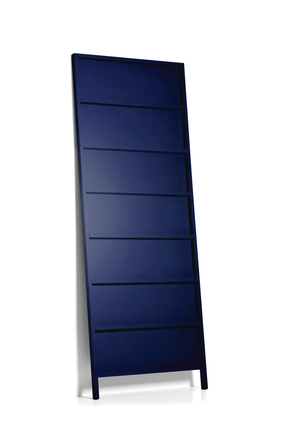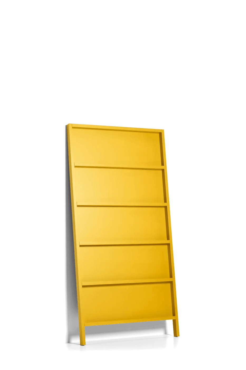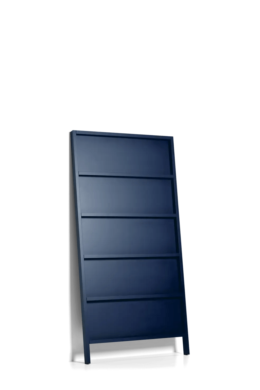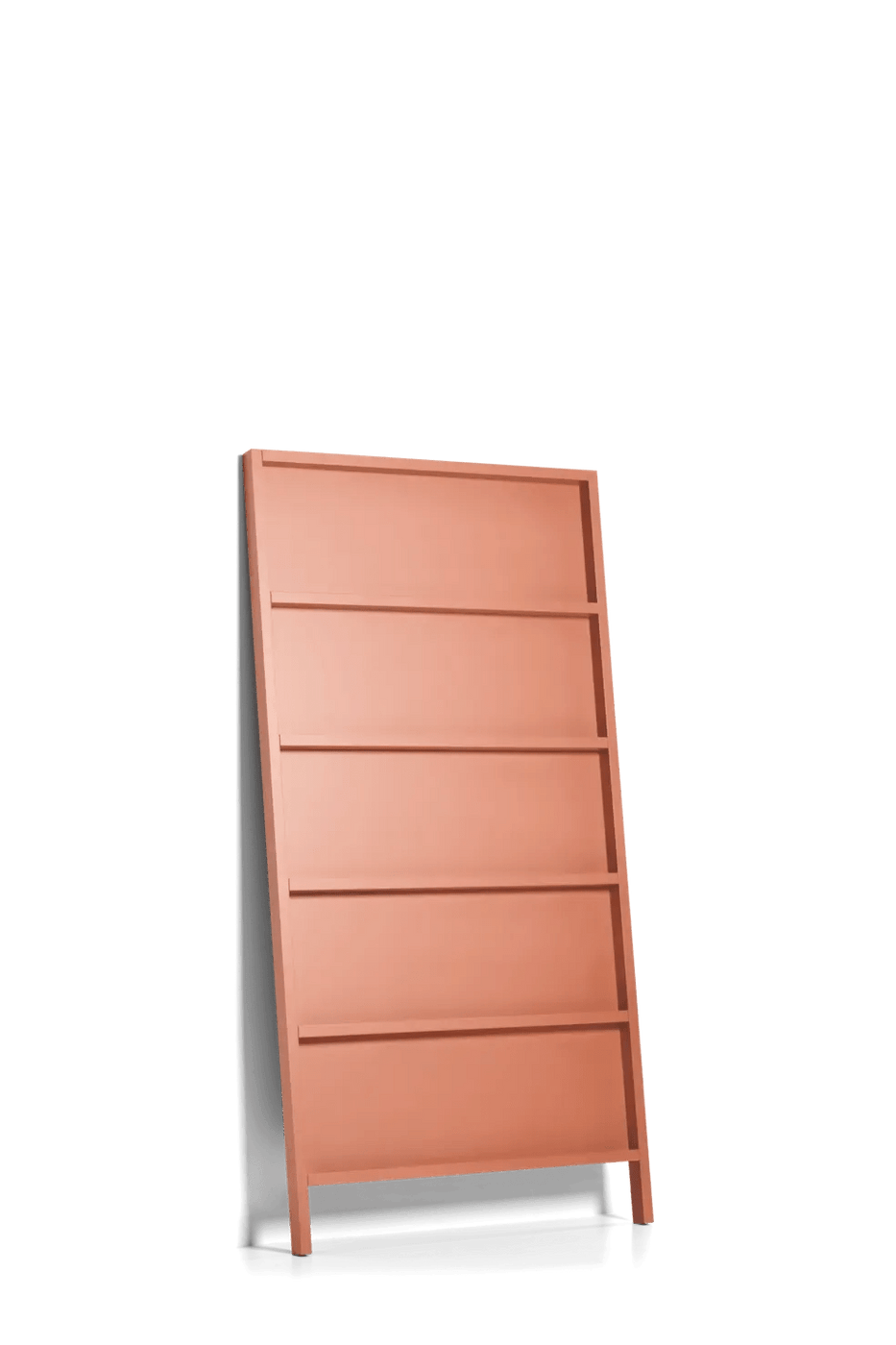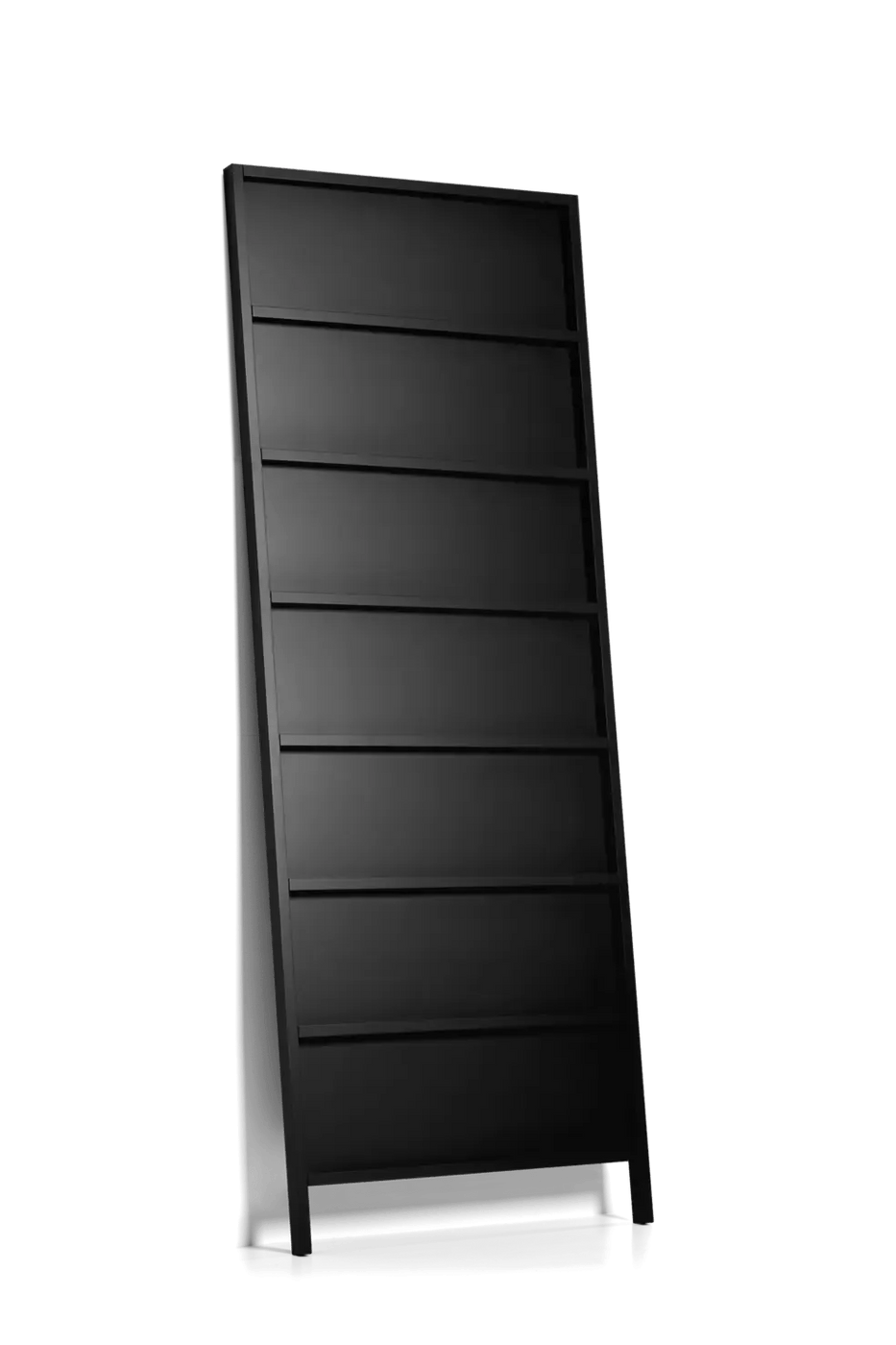 The Moooi Oblique is Marcel Wanders' solution to the problem of bookshelves taking up too much floor space - he just leaned the whole thing against the wall at an angle and called it done. Designed back in 2002, it's essentially a tall, narrow ladder-style shelf that props against your wall instead of mounting to it, which sounds precarious but works because of how the weight distribution and angle play out. The super-shallow 2.4-inch depth means this isn't for storing your hardcover collection, but it's perfect for displaying magazines, photo books, framed pictures, or creating what Wanders calls "the mood board of your lifestyle." The raised edge along each shelf stops everything from sliding off when the shelf leans back, which matters more than you'd think once you start loading it up with stuff. You can get it in solid oak with various stains or lacquered beech in a bunch of RAL colors including this traffic white, and the small version stands about 82 inches tall while the big one goes up to 112 inches.