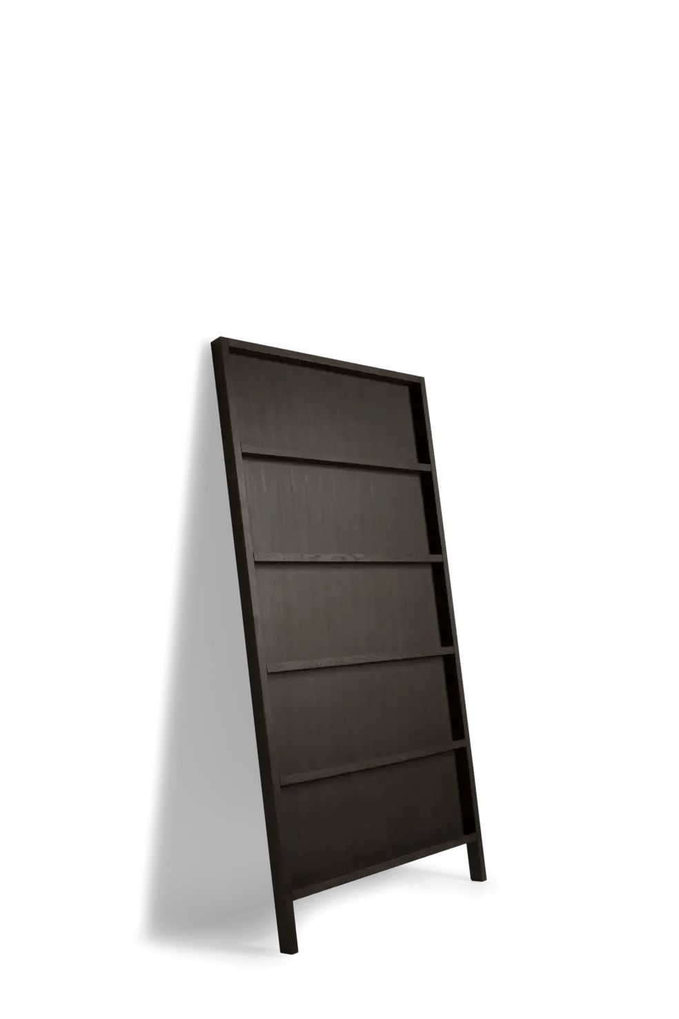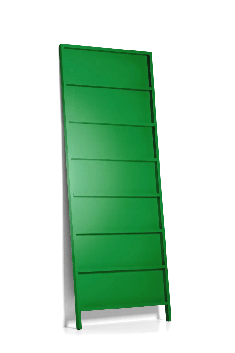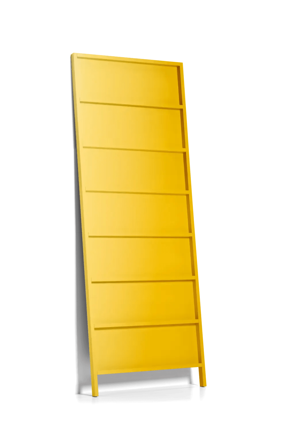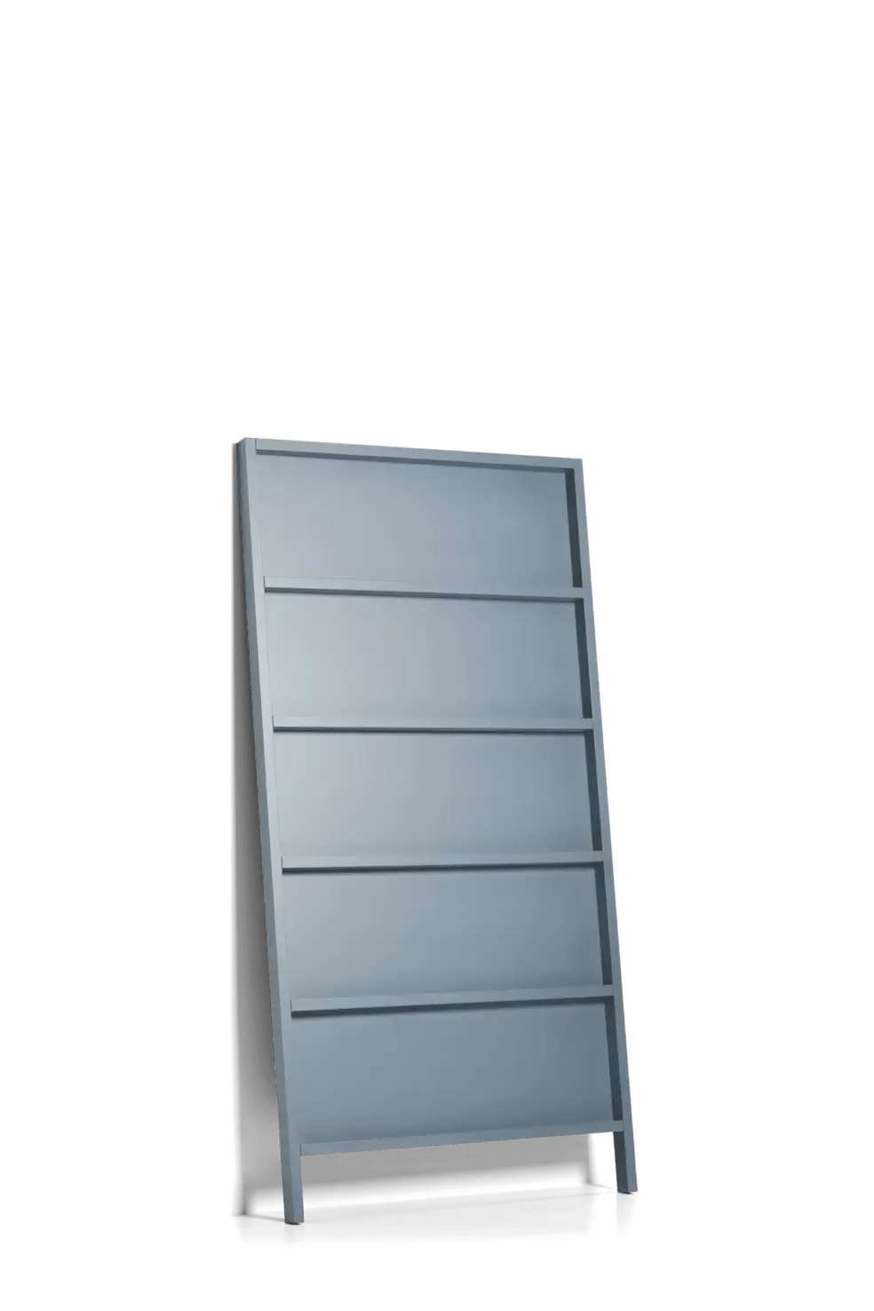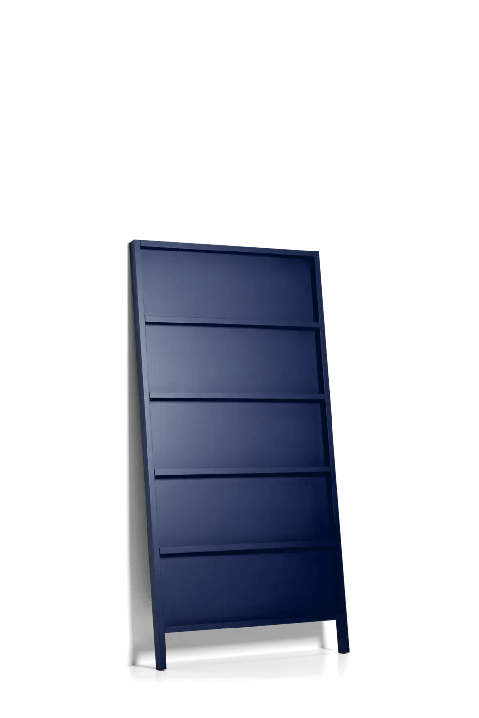 The Moooi Oblique is Marcel Wanders' solution to the problem of bookshelves taking up too much floor space - he just leaned the whole thing against the wall at an angle and called it done. Designed back in 2002, it's essentially a tall, narrow ladder-style shelf that props against your wall instead of mounting to it, which sounds precarious but works because of how the weight distribution and angle play out. The super-shallow 2.4-inch depth means this isn't for storing your hardcover collection, but it's perfect for displaying magazines, photo books, framed pictures, or creating what Wanders calls "the mood board of your lifestyle." The raised edge along each shelf stops everything from sliding off when the shelf leans back, which matters more than you'd think once you start loading it up with stuff. You can get it in solid oak with various stains or lacquered beech in a bunch of RAL colors including this traffic white, and the small version stands about 82 inches tall while the big one goes up to 112 inches.