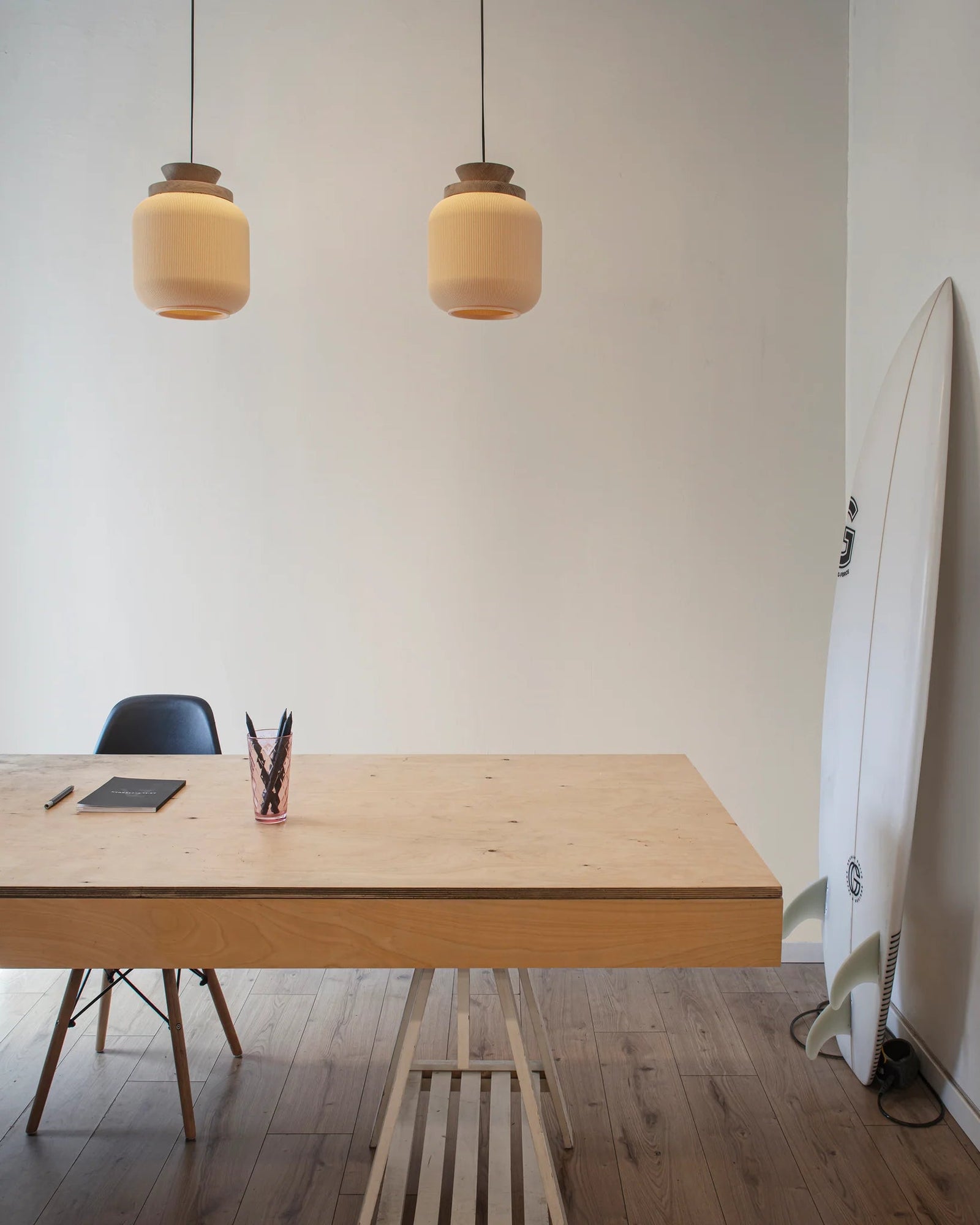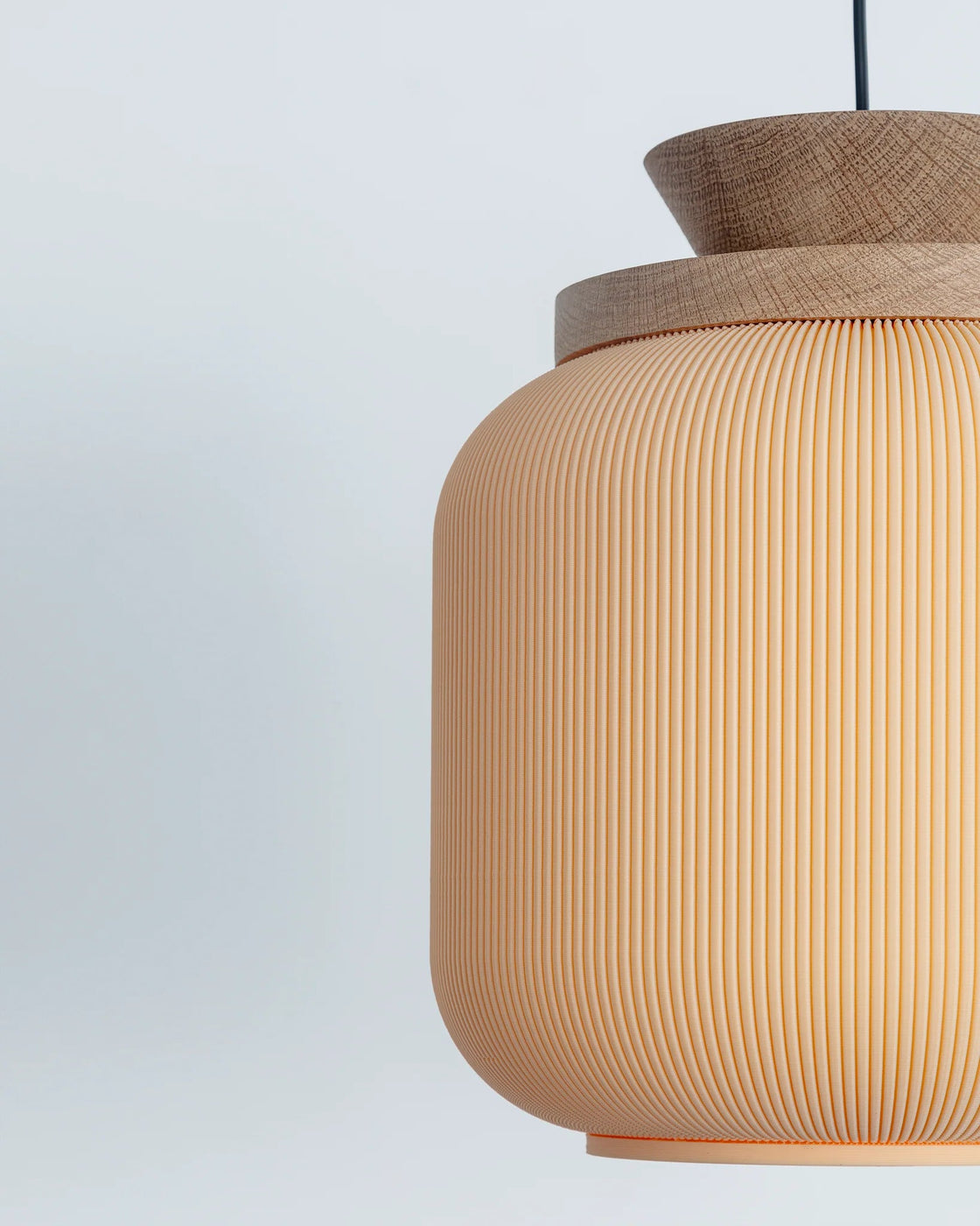 TThe Ariel Zuckerman O'R Pendant is a beautiful mix of tradition and modern design. Named after the Hebrew word for "light," it combines 3D-printed lampshades with the natural warmth of wood. The thoughtful pairing of materials creates a soft, welcoming glow that feels as gentle as fabric. This unique design makes it a standout piece that adds charm and warmth to any space.