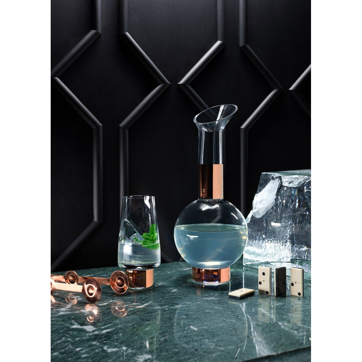 The Tank Series by Tom Dixon is bar ware that is designed to turn heads. Hand blown clear glass is given a unique detail of hand painted copper. The effect is dramatic and instantly classic. Each piece in the series – high ball glass, low ball glass, decanter and jug - is of generous proportions and presented in branded gift boxes. The pieces are food safe. Not dishwasher safe.