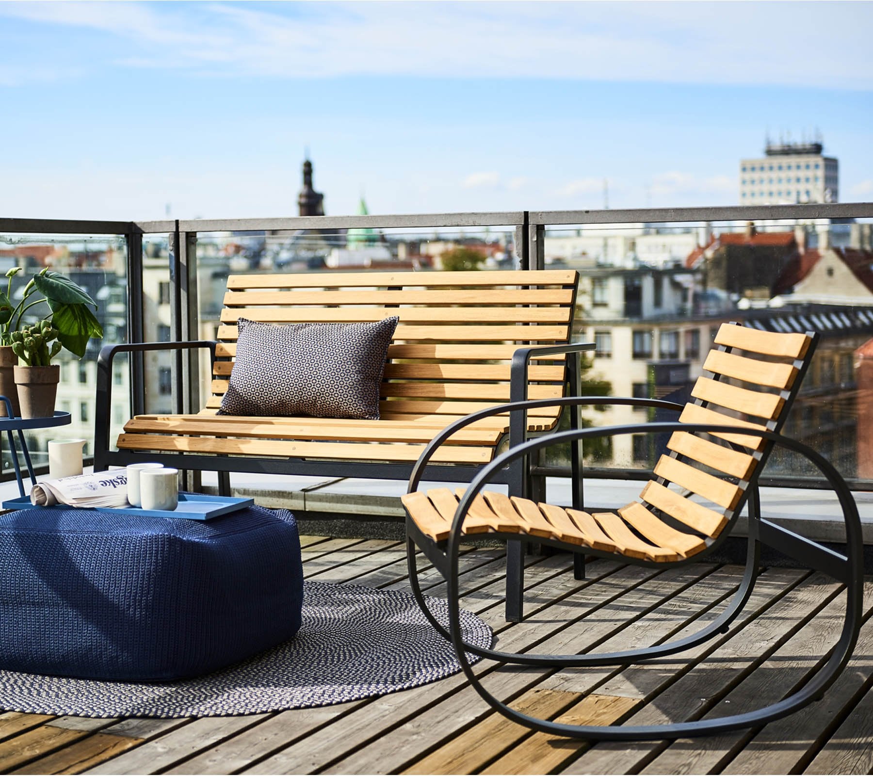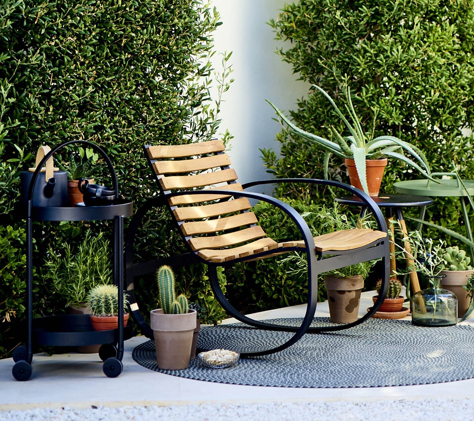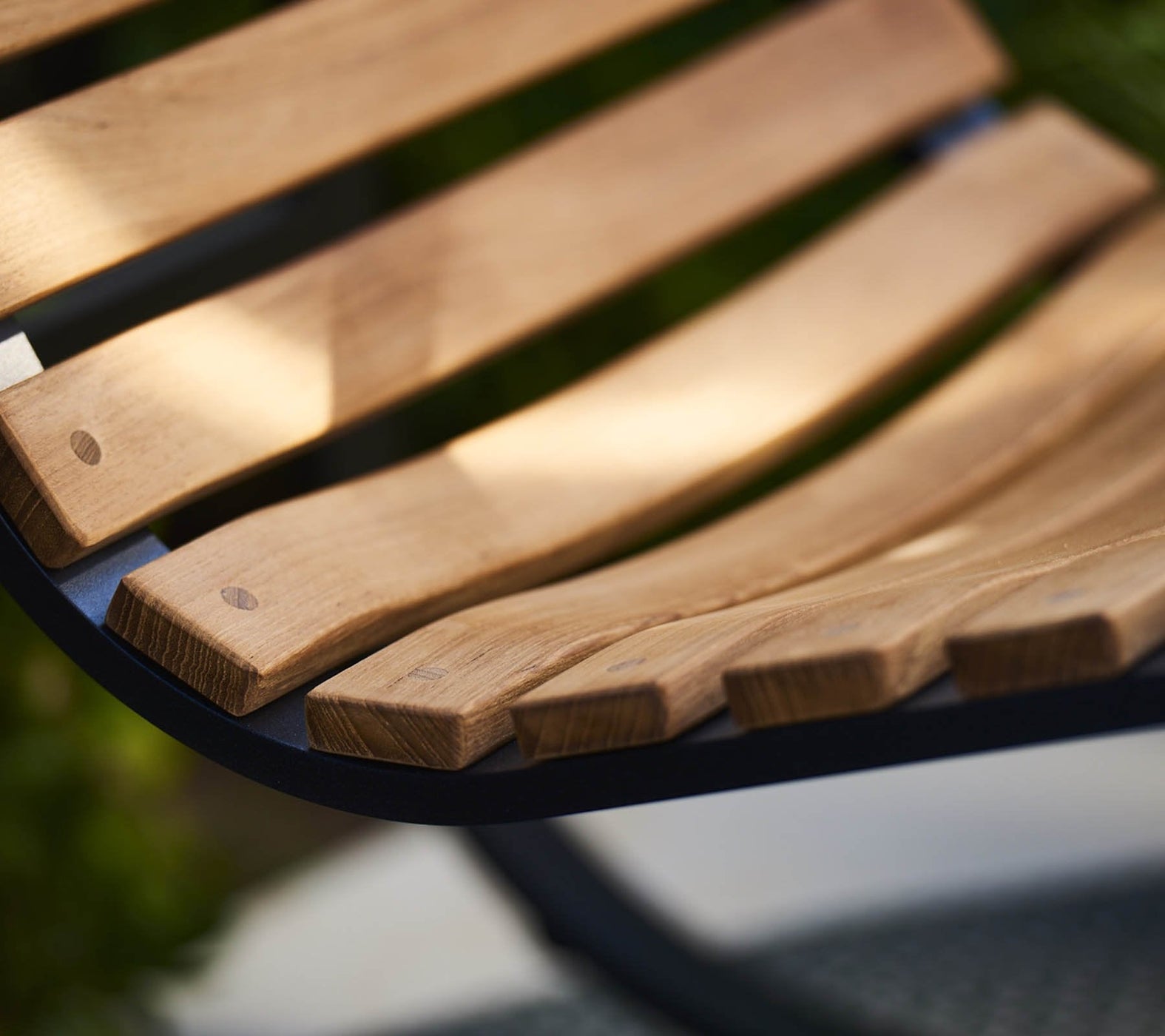 The Parc rocking chair is made of teak, designed by the Danish design duo Foersom & Hiort-Lorenzen MDD. The chairs are all "bodyfitted" so they follow the shape of the body and are extremely comfortable. The Parc series is suitable for both small as well as large outdoor spaces due to its different design options, from bench to rocking chair and dining chairs. Parc will fit any space due to its choice of natural material and its exclusive design. Parc is produced in certified teak and powder coated aluminum which ensure a resistant surface.