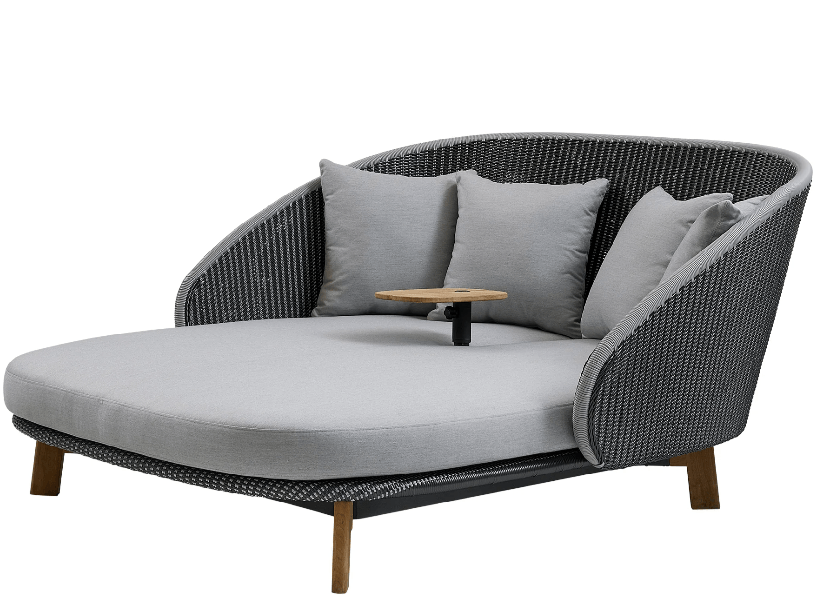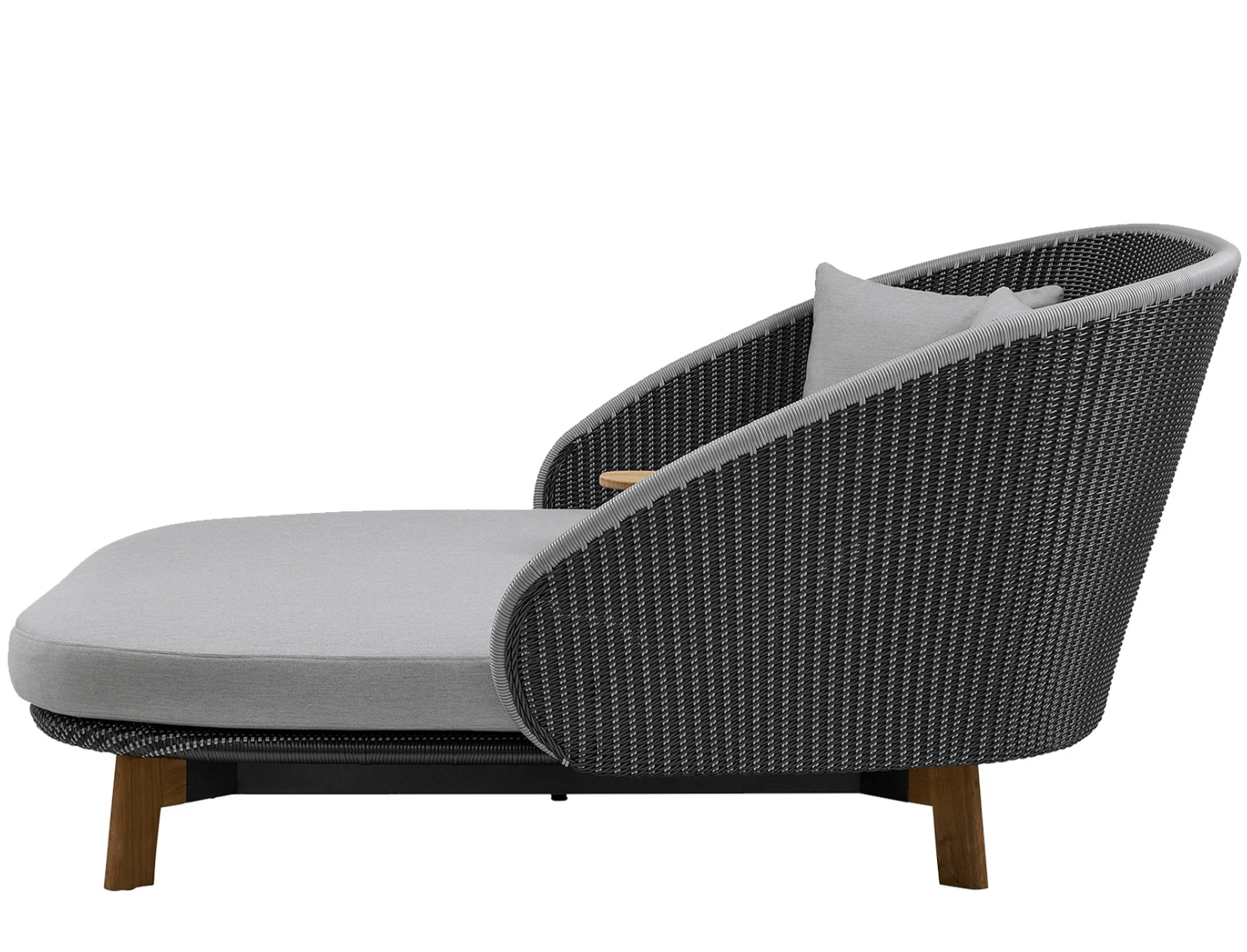 Peacock daybed is a beautiful visual furniture with comfort as the keyword. Peacock is a modern furniture designed by Foersom & Hiort-Lorenzen MDD. Peacock is available in Cane-line Weave®, which makes Peacock ideal for outdoor use in any climate as it is temperature and UV-resistant. It comes with a cushion set + 4 large back cushions (60x60 cm.) The Daybed cushions comes in an outstanding color; Cane-line Natté light grey. The mix of two colors in the weave gives a very unique look. The Peacock Daybed comes with a small teak table, and can also be combined with our Classic parasol as an acquisition.