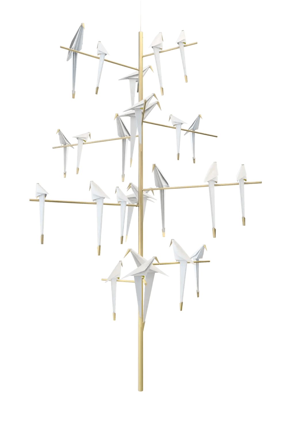 The Moooi Perch Light Tree by Umut Yamac takes the entire bird-on-a-branch concept and scales it up into something absolutely jaw-dropping - we're talking about 25 illuminated birds nestled across multiple brass branches in this massive chandelier that measures over 8 feet tall. It's like having an entire flock decide to make your dining room their home, except each bird glows with warm LED light and gently rocks when you brush past them. The thing is seriously impressive at almost 47 pounds, but that weight gives it this substantial presence that fills grand spaces without looking lost. Every bird is crafted from synthetic paper and polycarbonate, so they feel delicate and lifelike while still being durable enough for everyday life - and yes, they actually move and sway just like real birds would.