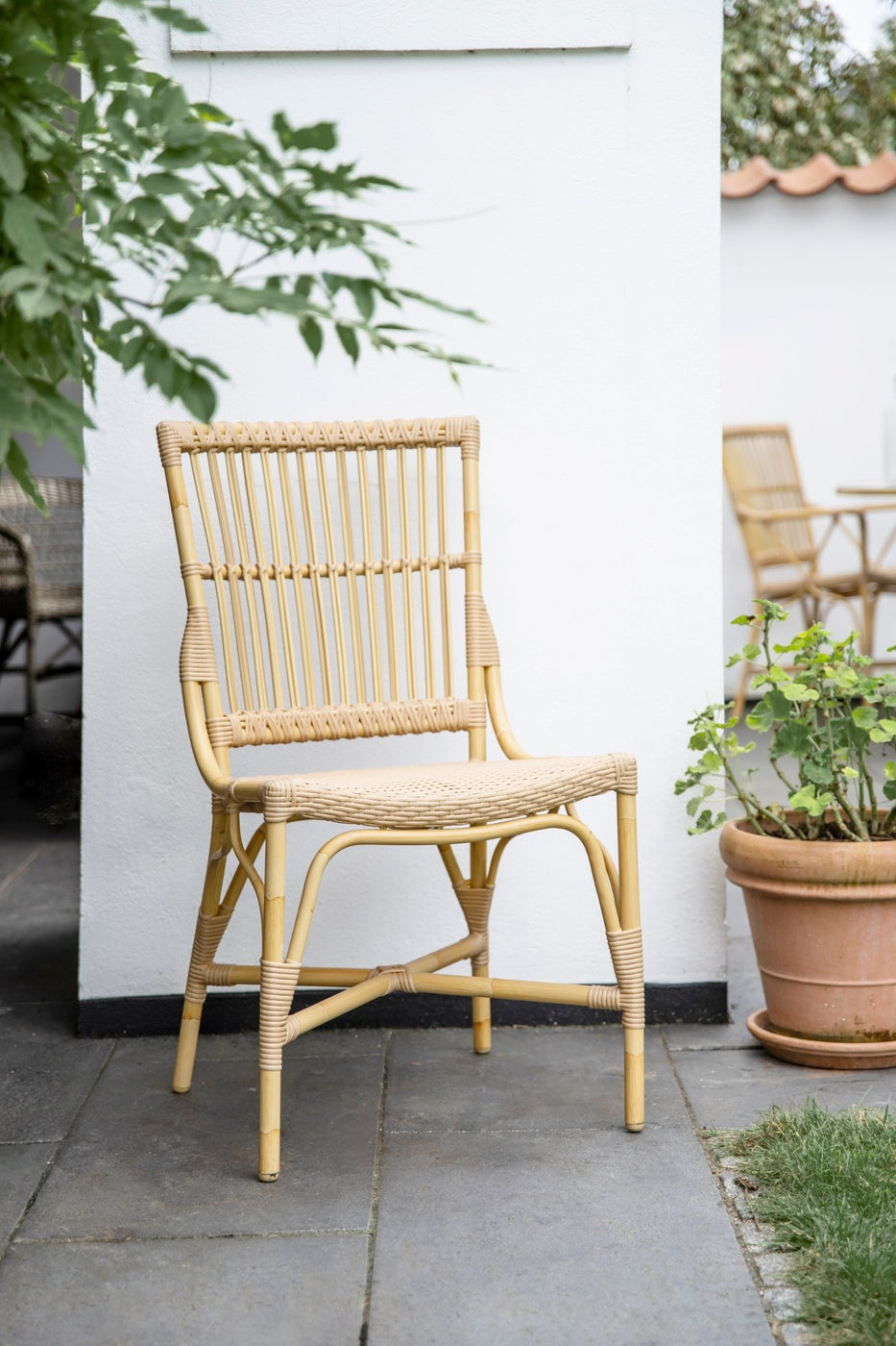 The Piano Side Chair Exterior by Sika Design brings a modern look to your outdoor space. Crafted from AluRattan and ArtFibre, this chair is durable and built for comfort. With its curved backrest and woven seat, the Piano Side Chair Exterior blends style and function, perfect for pairing with an outdoor dining table or outdoor lounge chairs.