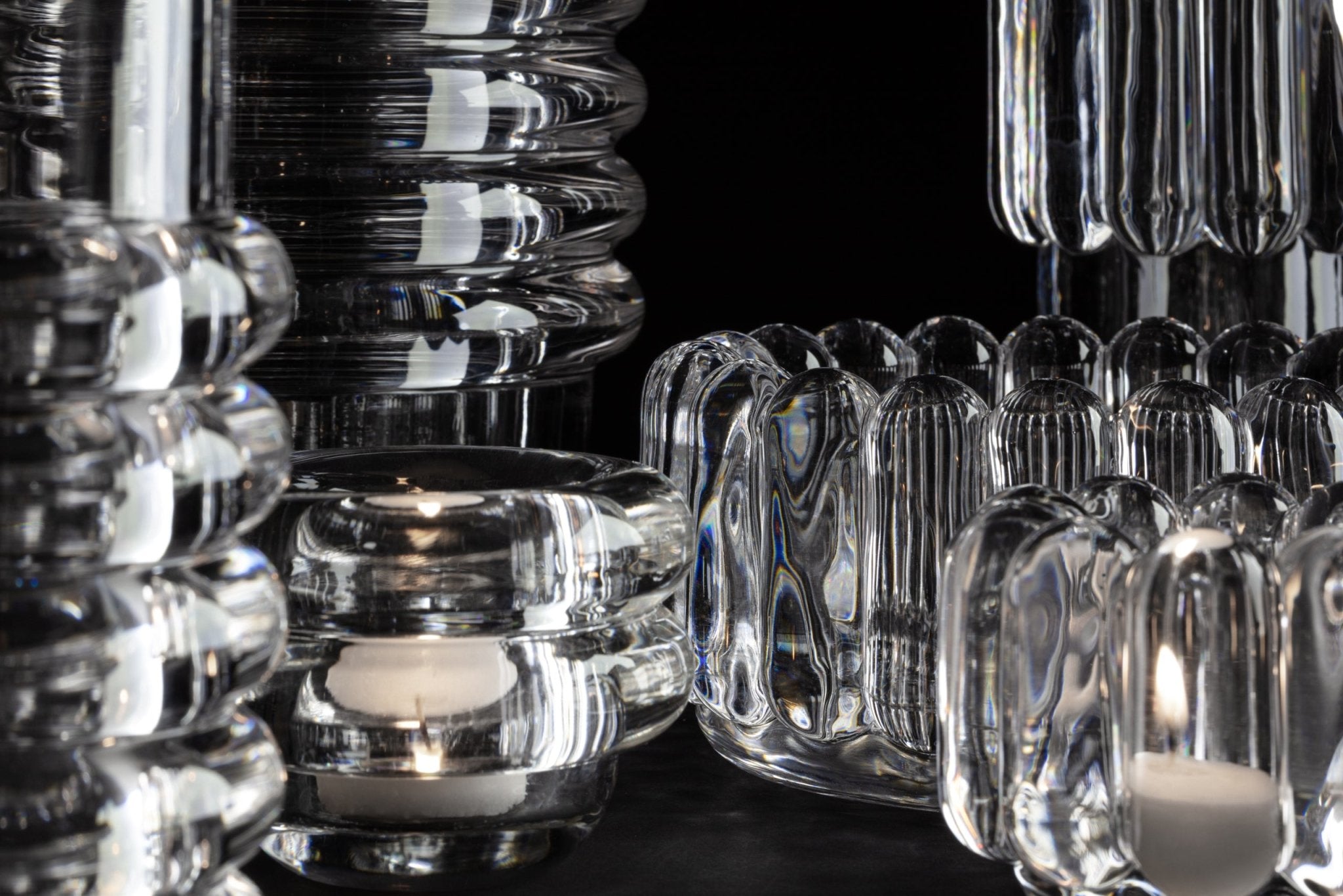 Press is a stem vase designed and engineered to catch and refract light, and to last for ever. This heavyweight grooved vase is made of fat, chunky coils of pure and clear transparent glass. Bold in silhouette and simple in function, it is manufactured by dropping big globs of molten glass at 1,200 degrees centigrade and pressed in two or three part iron moulds to create the immediately familiar silhouette.