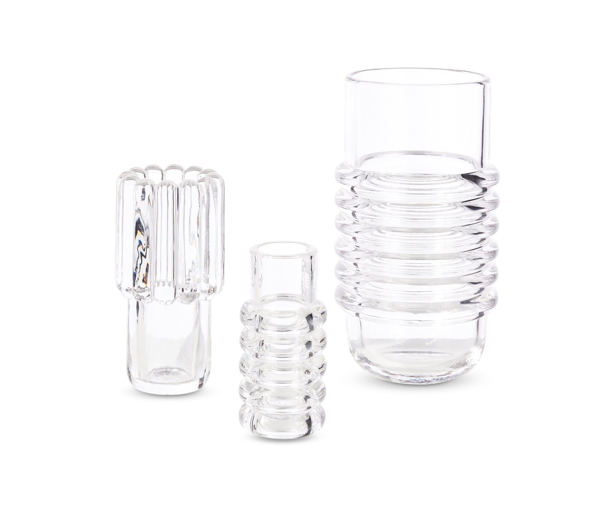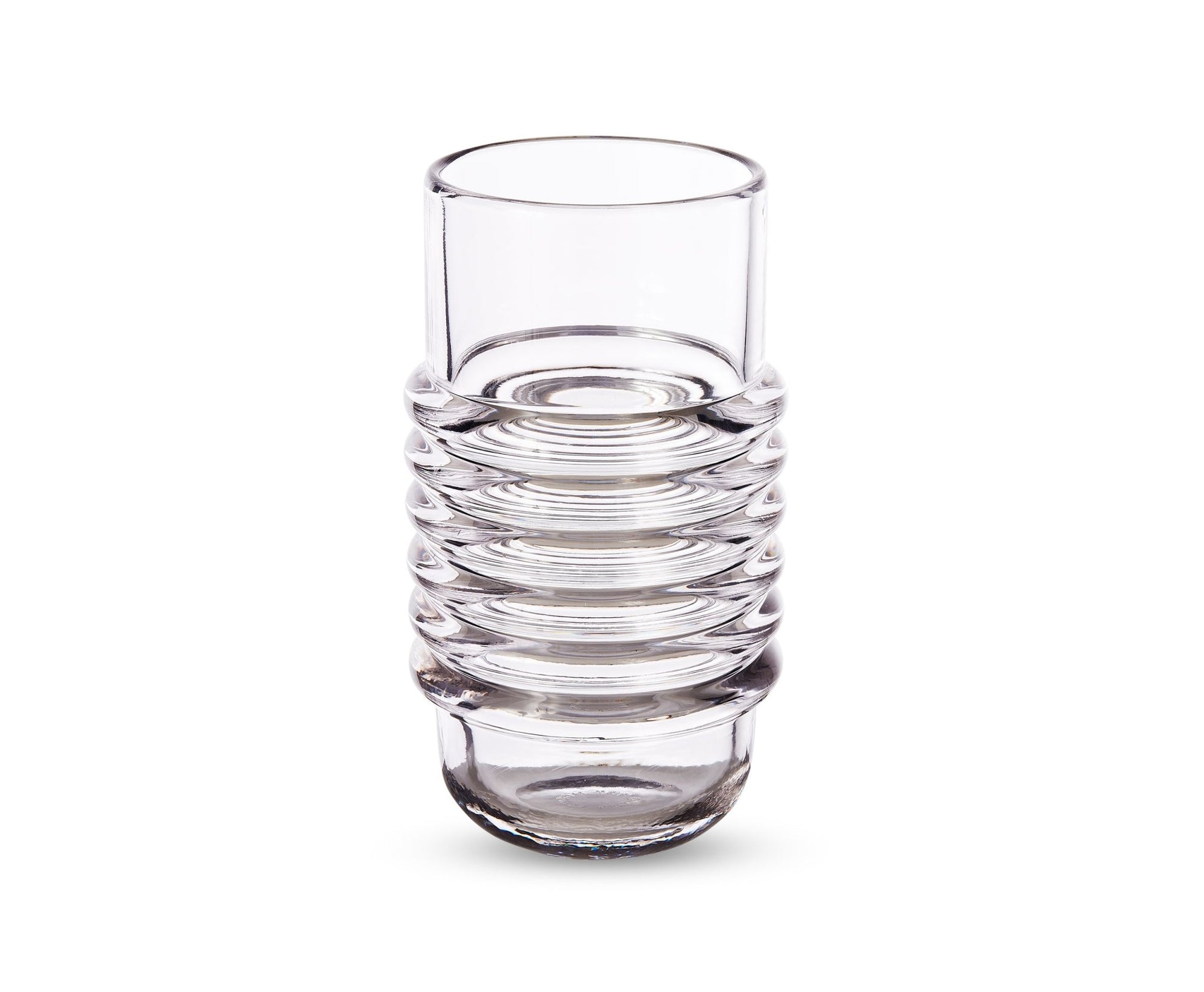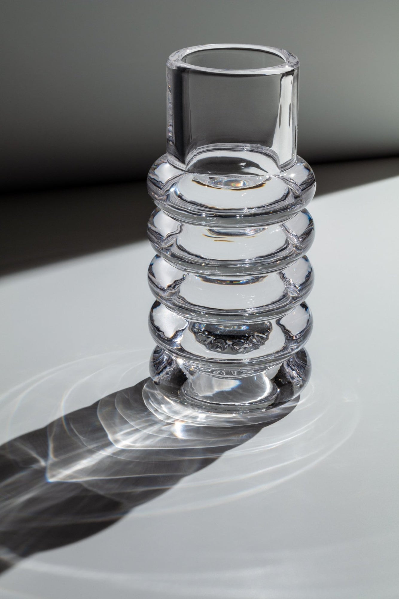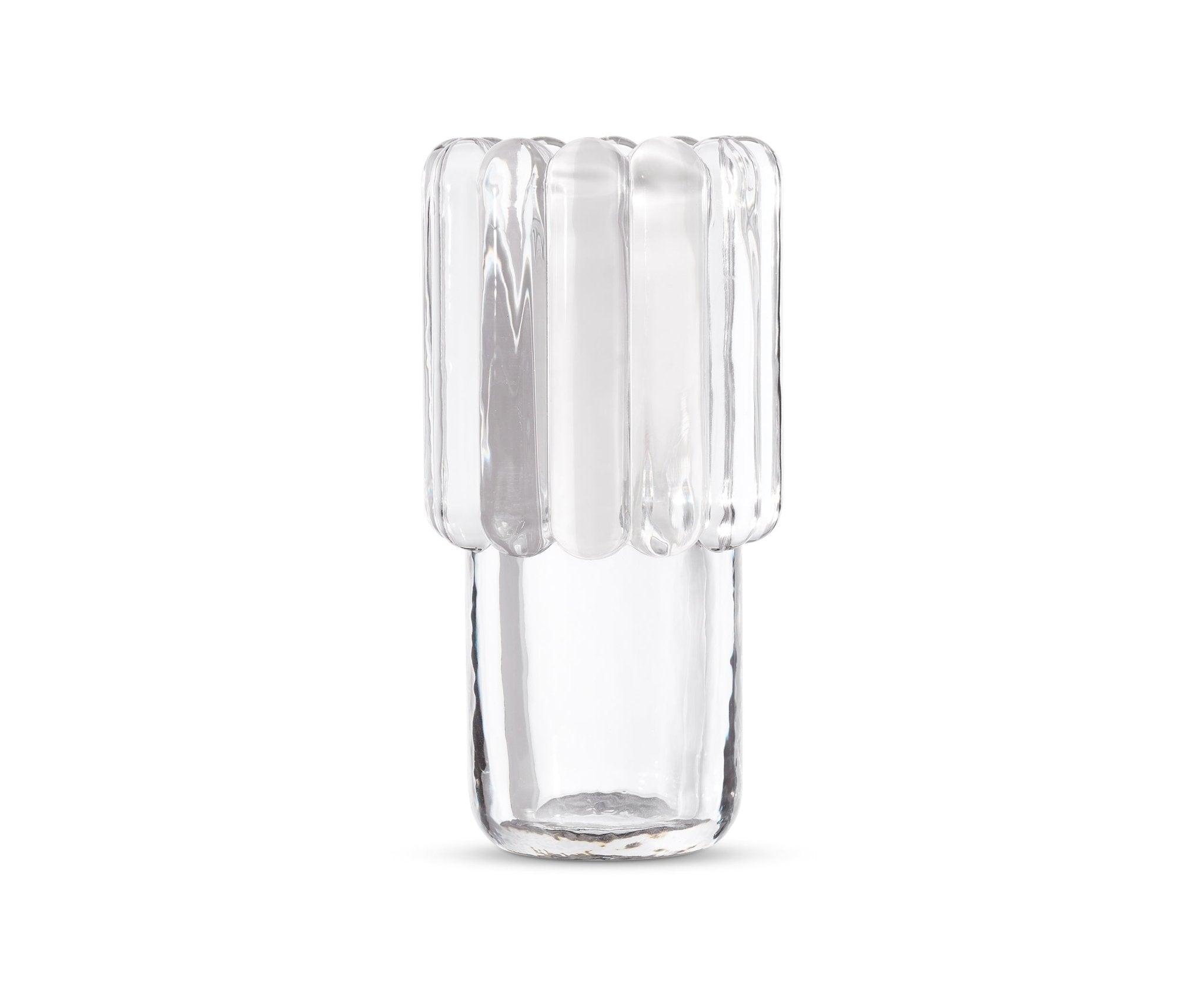 Press is designed and engineered to catch and refract light, and to last for ever. This heavyweight grooved vase is made of fat, chunky coils of pure and clear transparent glass. Bold in silhouette and simple in function, it is manufactured by dropping big globs of molten glass at 1,200 degrees centigrade and pressed in two or three part iron moulds to create the immediately familiar silhouette.