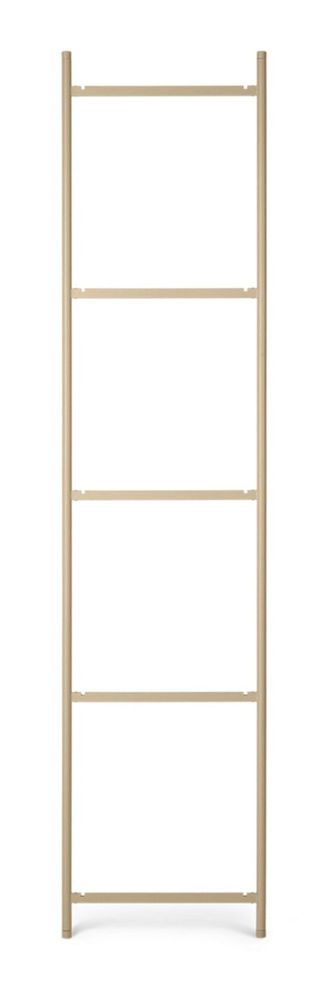 Punctual is a sleek, yet durable modular shelving system available in a range of configurations to suit every need. Made to last from powder-coated metal, slender tubes and practical shelves perforated with tiny holes for a softer expression are easy to assemble. The industrial-inspired design has a classical feel thanks to its understated cashmere-coloured coating, making it work in any setting — from a kitchen to a bedroom.