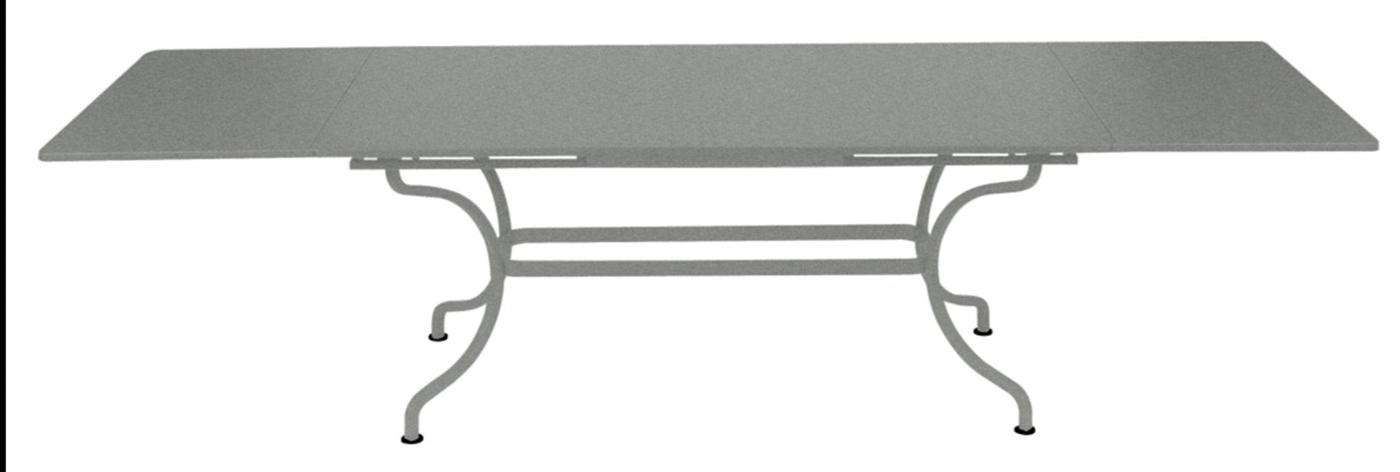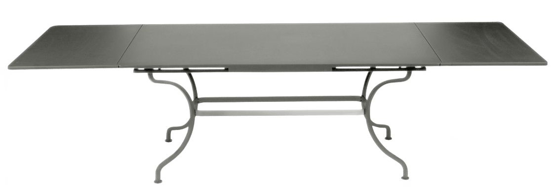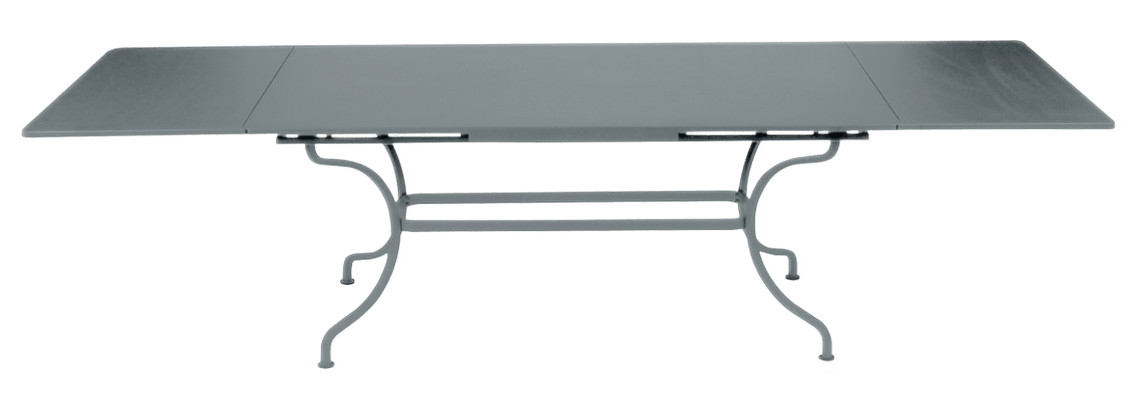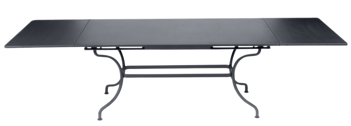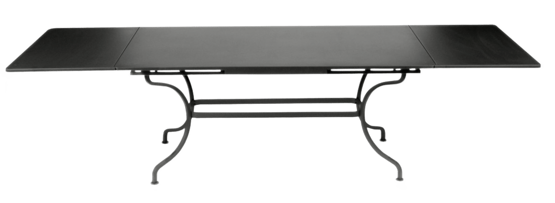 The Romane Table is 118 x 39" when its extensions are open and 79 x 39" when closed. Can fit between ten to fourteen guests. Its base is solid steel and has a flat steel belt. The table top is solid steel sheet and has rounded corners. The cataphoresis finish, a high protection treatment makes it great for outdoor use.