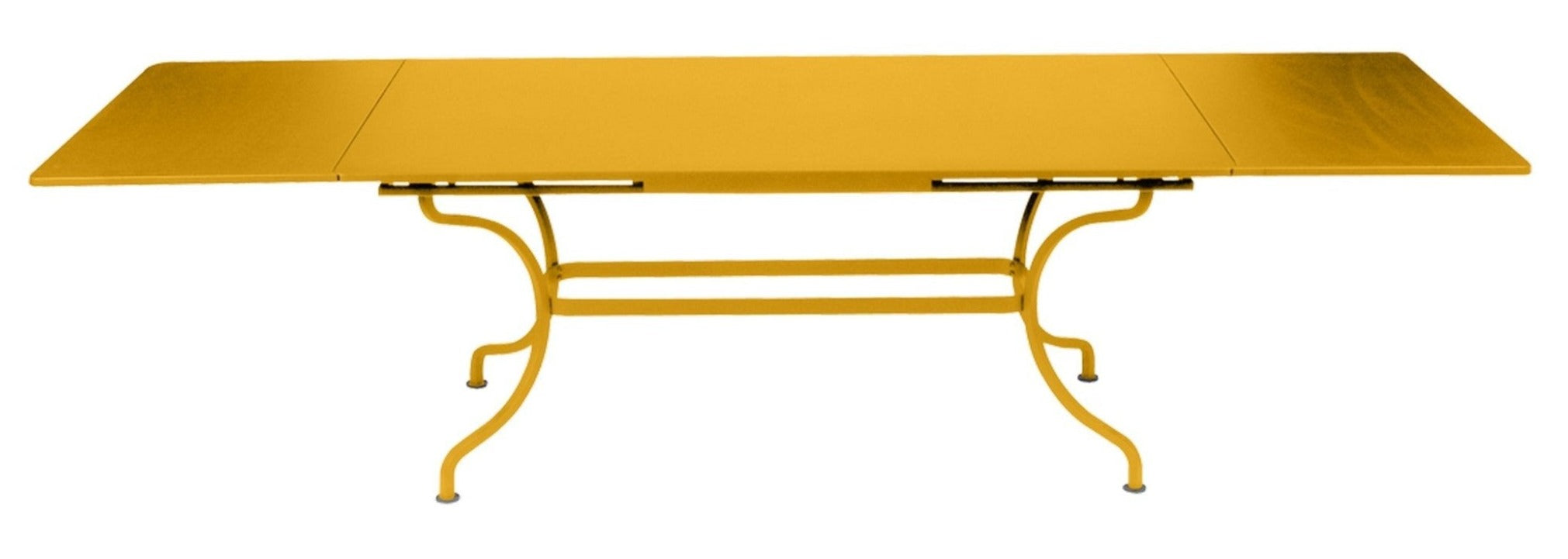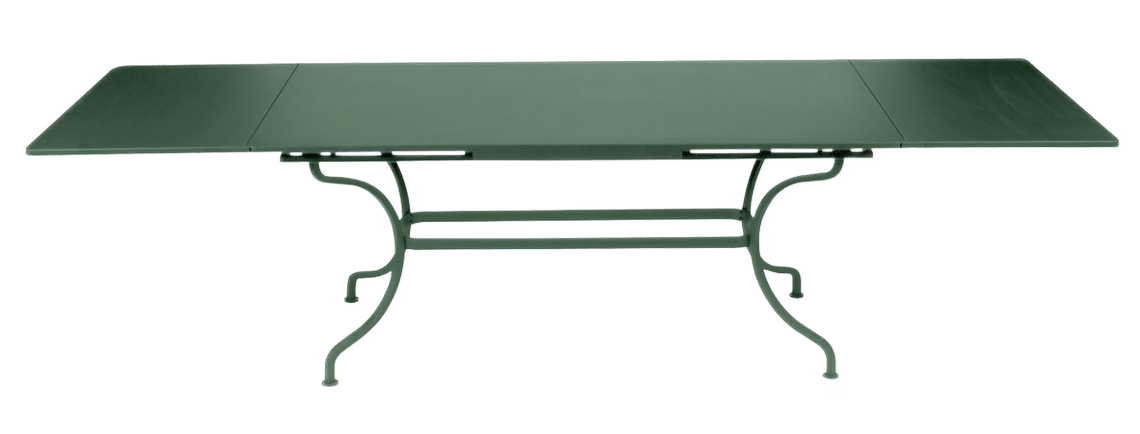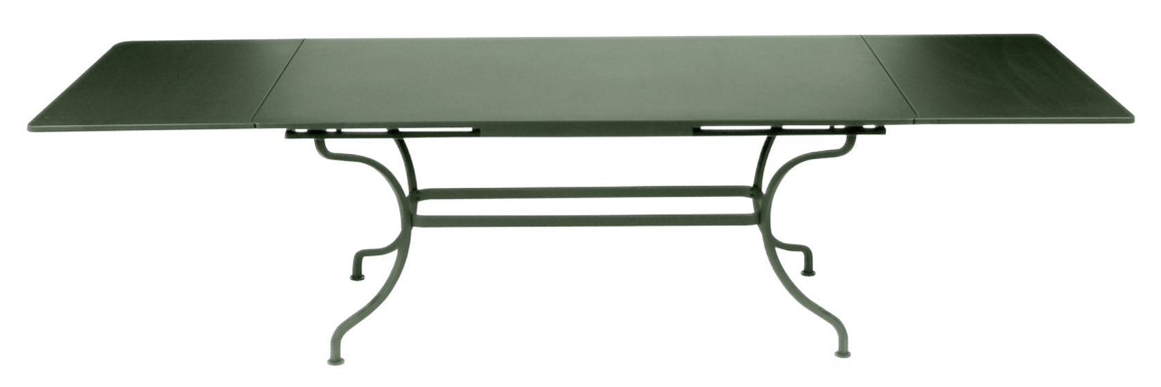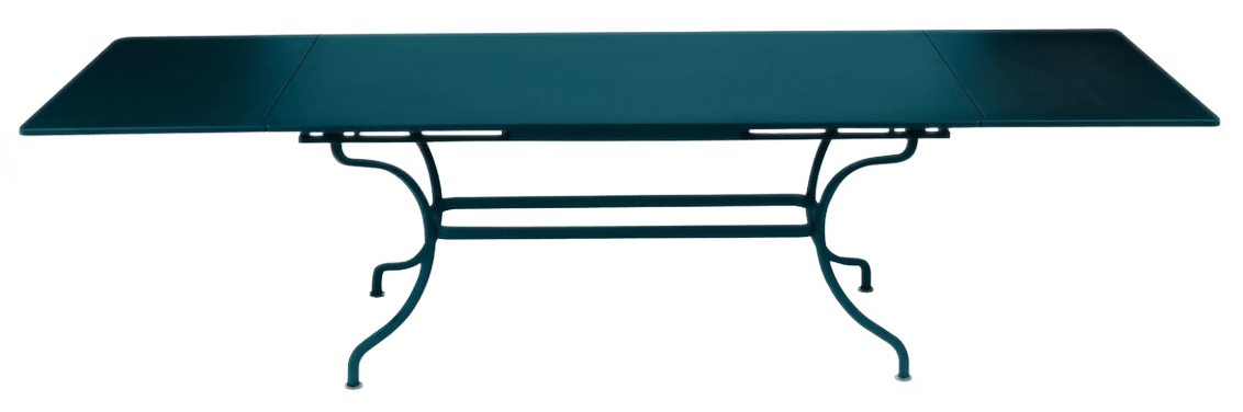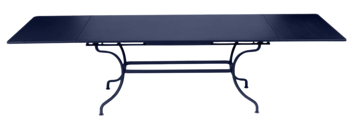 The Romane Table is 118 x 39" when its extensions are open and 79 x 39" when closed. Can fit between ten to fourteen guests. Its base is solid steel and has a flat steel belt. The table top is solid steel sheet and has rounded corners. The cataphoresis finish, a high protection treatment makes it great for outdoor use.