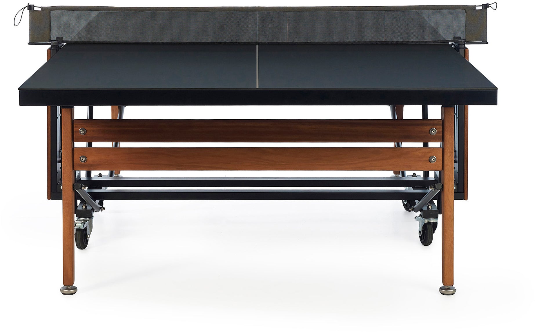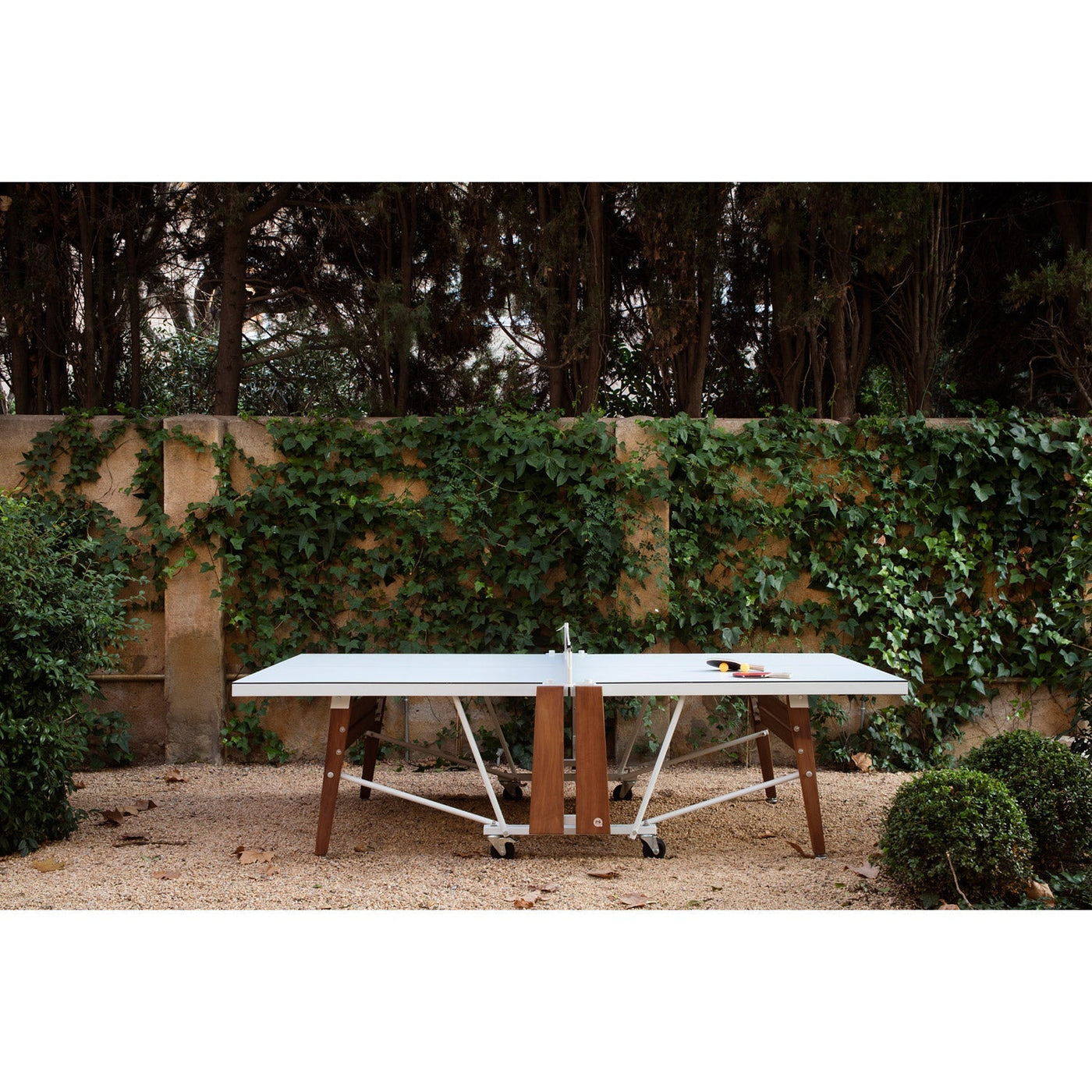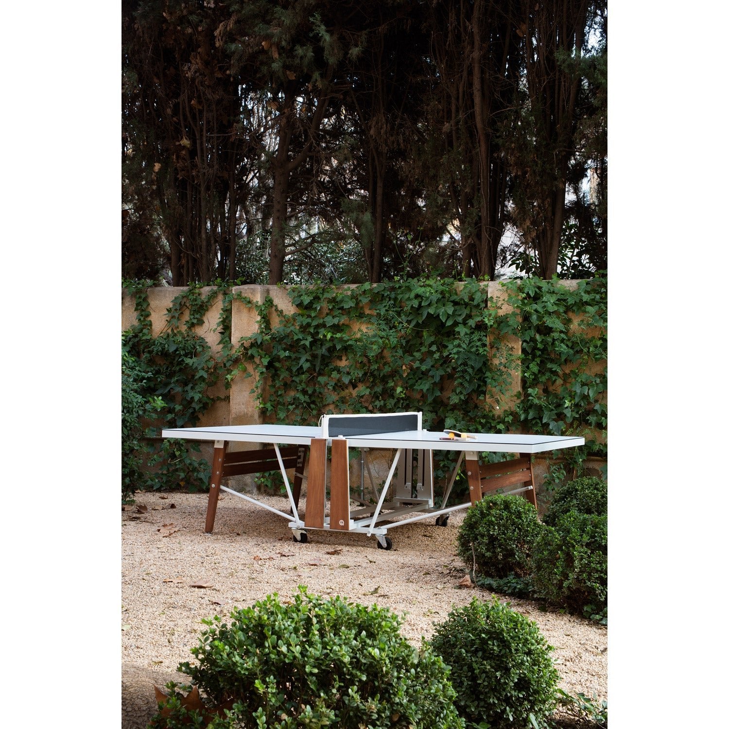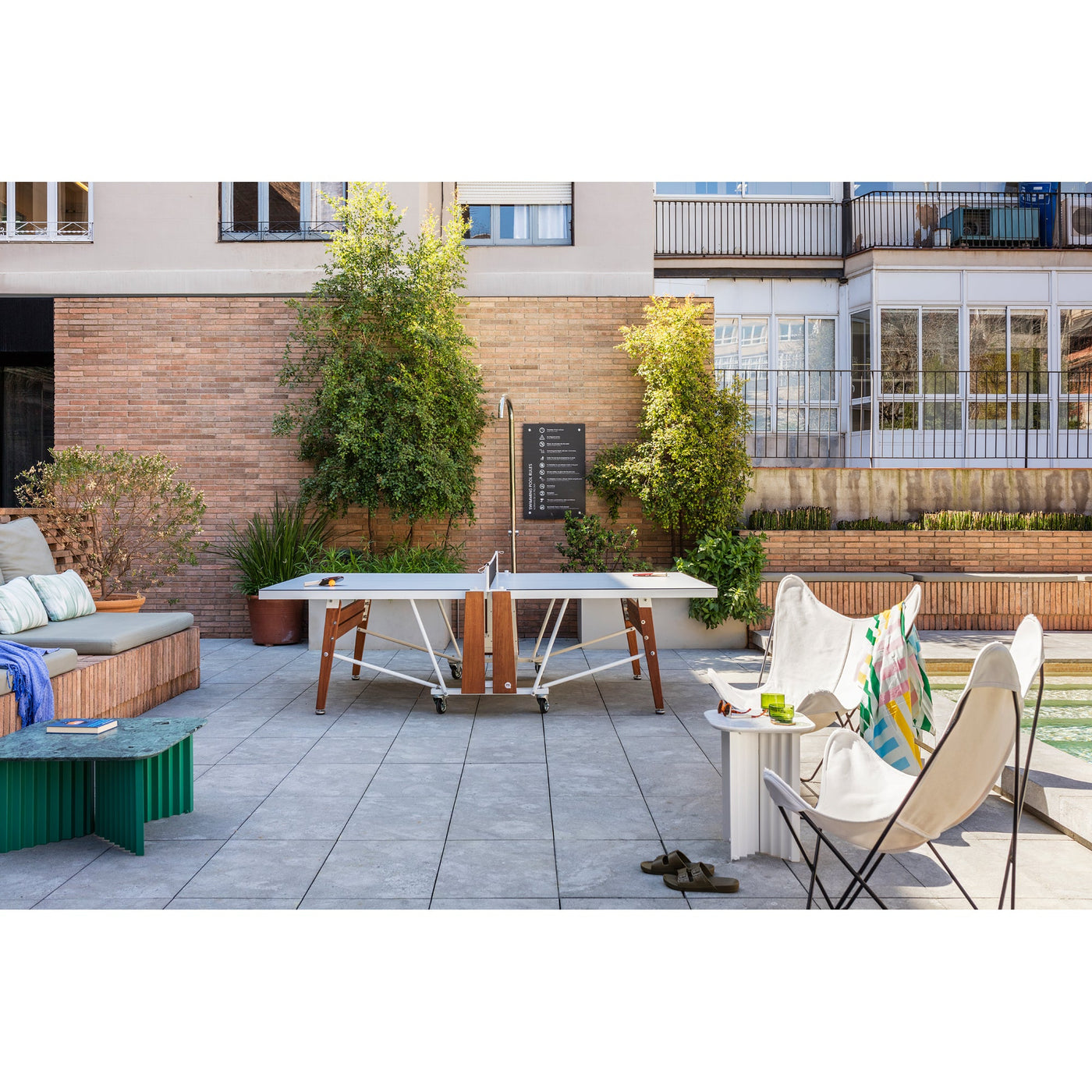 The RS Folding RS Barcelona Ping Pong Table is a versatile and stylish addition to any space, offering full playability and stability. Designed for both indoor and outdoor use, its high-density HPL top and iroko wood legs ensure durability and elegance. The folding mechanism and built-in wheels allow for easy mobility and storage, making it perfect for spontaneous games and seamless integration into various environments.
