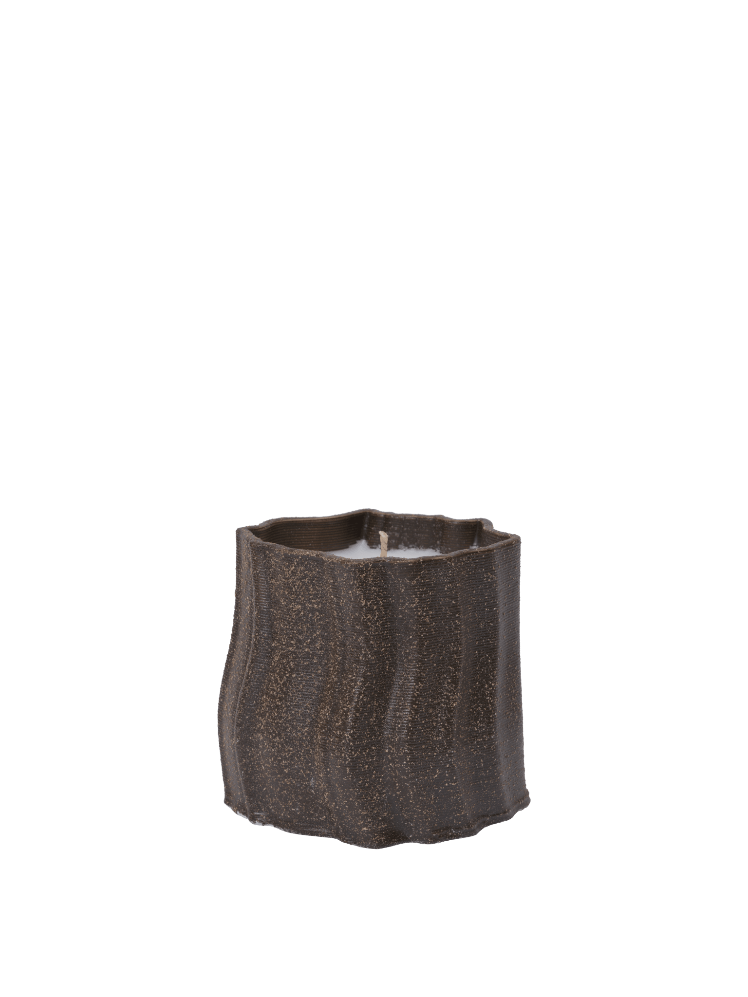 Crafted from 3D-printed ceramic, the Rylith Scented Candle evokes the organic beauty of natural stone formations. Vertical, undulating ridges flow along the vessel, while subtle twists in the geometry create a sense of movement. Once the candle has burned out, the sculptural vessel can be repurposed as a decorative object. Finished in a dark brown glaze, this candle is infused with a soft, herbal chamomile fragrance that brings a calming atmosphere to any space.