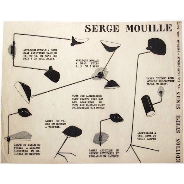 Serge Mouille originally studied silversmithing and metallurgy at the School of Applied Arts in Paris after being admitted at the age of 13. He had great success as a silversmith and began teaching by the age of 25. It was not until he was 31 that Serge Mouille introduced his first lighting fixture. His lamps were inspired by insect-like minimalism and were an intentional departure from the more complicated lamps of his time. Mouille's fixtures were first shown in a gallery in 1956 along designs by Charlotte Perriand, Isamu Noguchi and Jean Prouvé. His lighting fixtures are a blend of function and art that many have come to appreciate throughout the years.