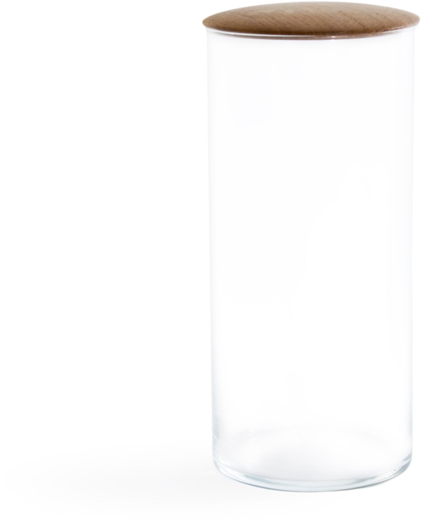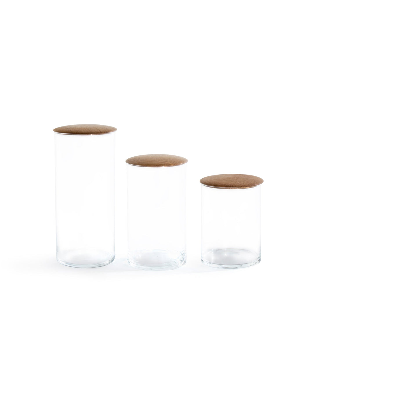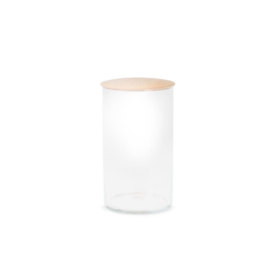 Simple glass containers paired with oil rubbed, turned oak lids. These storage containers are perfect for storing dry goods in the kitchen, bathroom essentials, or equally useful as small collection containers or terrariums. Use these in a grouping for an interesting addition of verticality to any space.