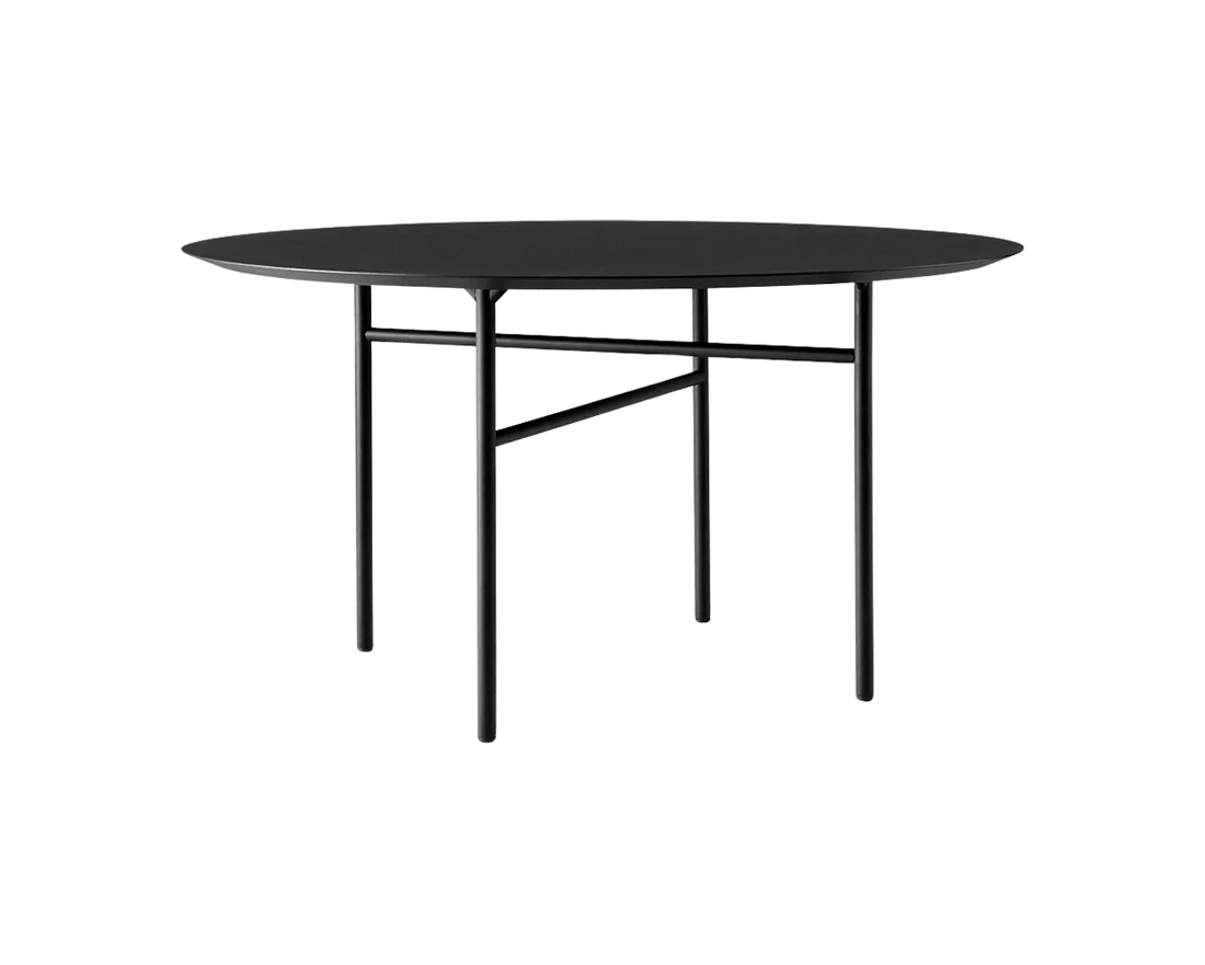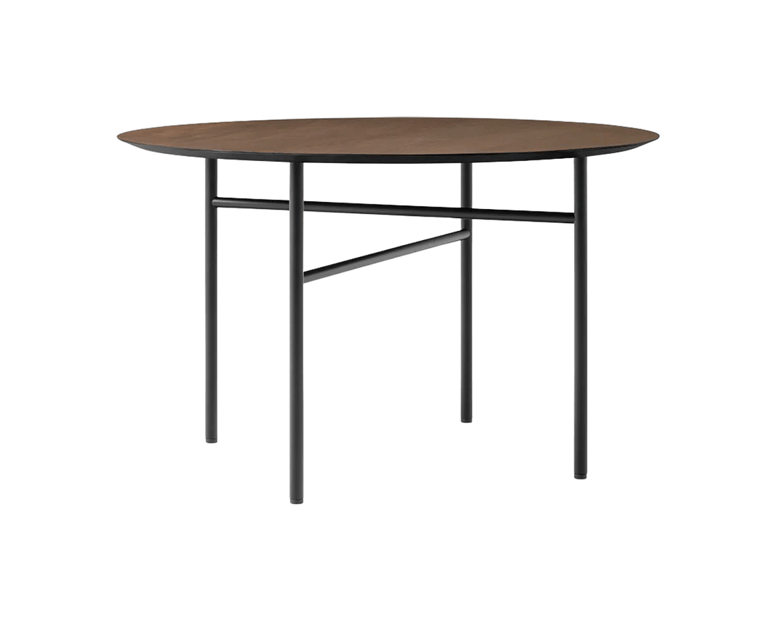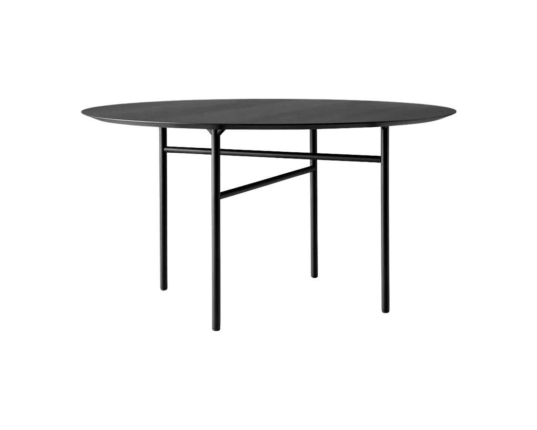 The Audo Copenhagen Snaregade Round Dining Table brings that same elegant, minimalist design philosophy as the rectangular and oval versions but in a circular format that fundamentally changes how people interact around meals. Designed by Norm Architects and originally created for Audo founder Bjarne Hansen's own dining room, the round shape creates equal seating where everyone faces each other naturally without head-of-table hierarchy. At 83cm height and 120cm diameter, it seats 4-5 people comfortably with that efficient use of space and visual lightness that defines the Snaregade collection. Available in black-stained or dark-stained oak veneer tops over plywood, paired with powder-coated black steel bases that create that signature thin silhouette, or with newer linoleum tops that handle the realities of daily family dinners and restaurant service without showing every mark.
