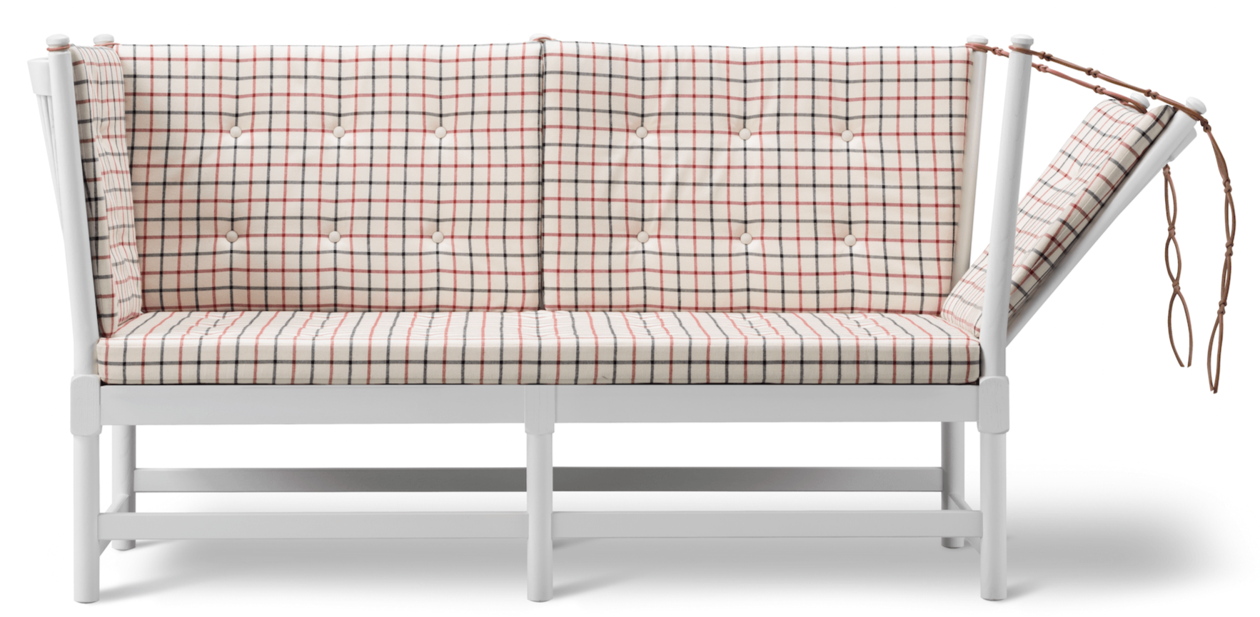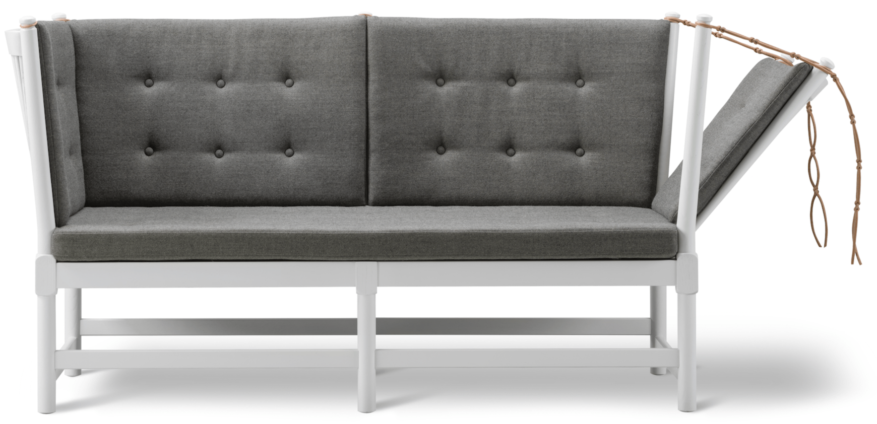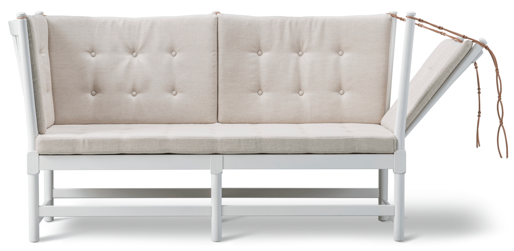 The Fredericia Spoke-Back Sofa - White Lacquered Oak is an innovative design by Hans J. Wegner and Børge Mogensen. Featuring a hinged side, it seamlessly transforms from a two-seater sofa into a daybed, providing excellent versatility. The sofa's design, inspired by Wegner's Spoke-Back Chair, combines the best of American Shaker aesthetics with modern functionality. Perfect for bedrooms, living rooms, or sunrooms, this piece brings comfort and style into any space.