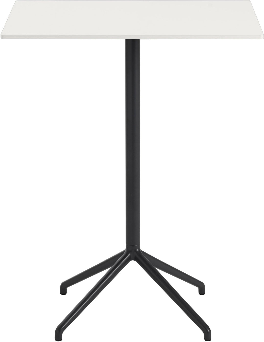 A series of café tables with a clean expression and apparent function on a four-legged base, complemented by the angled edges of its table top. Table top is made from MDF with the option of nanolaminate or linoleum finish. The edges are painted. Frame is made from die-cast aluminum. The mounting plate and tube is in powder coated steel.