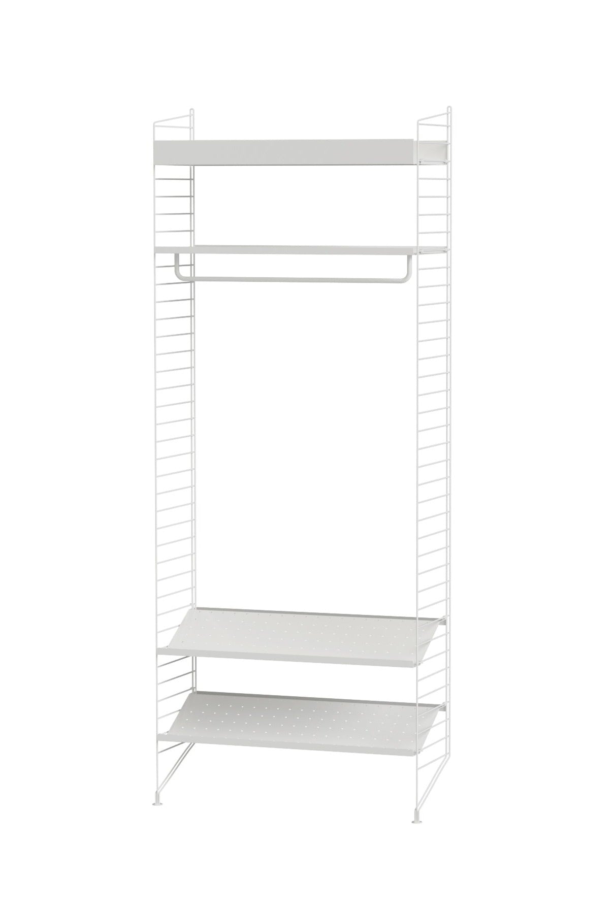 The String Furniture Hallway Shelving - Unit L keeps your entryway tidy without taking up too much space. It features one high-edged metal shelf for bags and accessories. Below, a lower shelf and integrated rod let you hang jackets, scarves, or totes. This string unit’s open design keeps your hallway light and airy, while its sleek silhouette works beautifully in any modern or Scandinavian interior.
