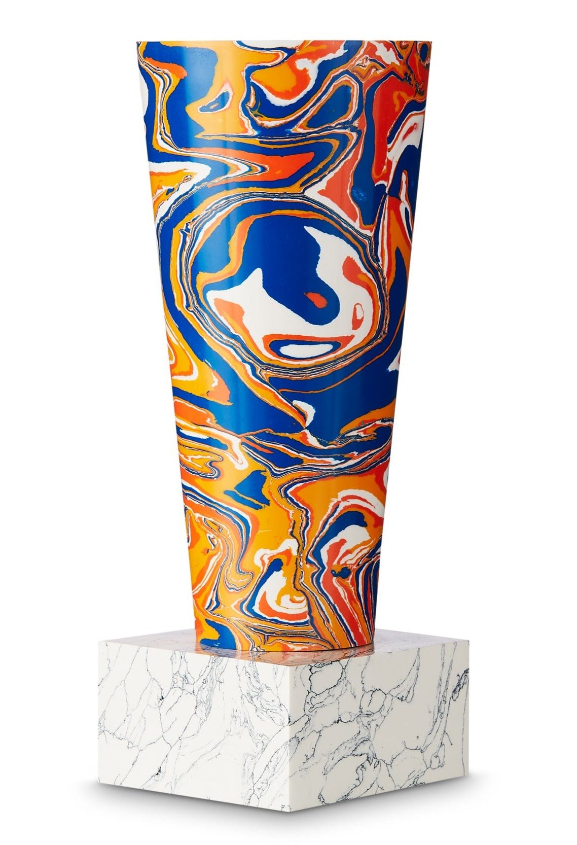 A psychedelic update of an Italian post-modernist aesthetic, the pop sensibility of Swirl is created from a series of geometric forms stacked upon one another to create multi-dimensional, functional sculptures. The unique process involves recycling the powdered residue from the marble industry, mixed with pigment and resin to create blocks of material that can then be sawn, sliced and turned on a lathe. Stem, Small and Medium vases are inspired by Ikebana, which is the Japanese art of flower arrangement. Anchored with a heavy base, the cylindrical vessels allow branches and flowers to cantilever out.