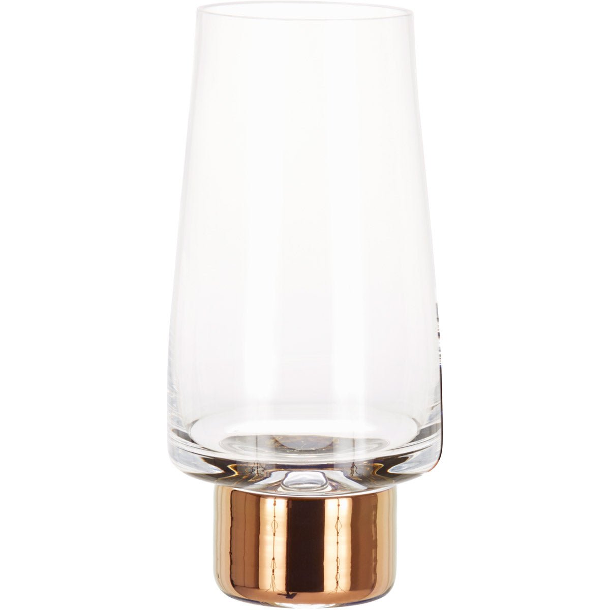 The Tank Series by Tom Dixon is bar ware that is designed to turn heads. Hand blown clear glass is given a unique detail of hand painted copper. The effect is dramatic and instantly classic. Each piece in the series – high ball glass, low ball glass, decanter and jug - is of generous proportions and presented in branded gift boxes. The pieces are food safe. Not dishwasher safe.