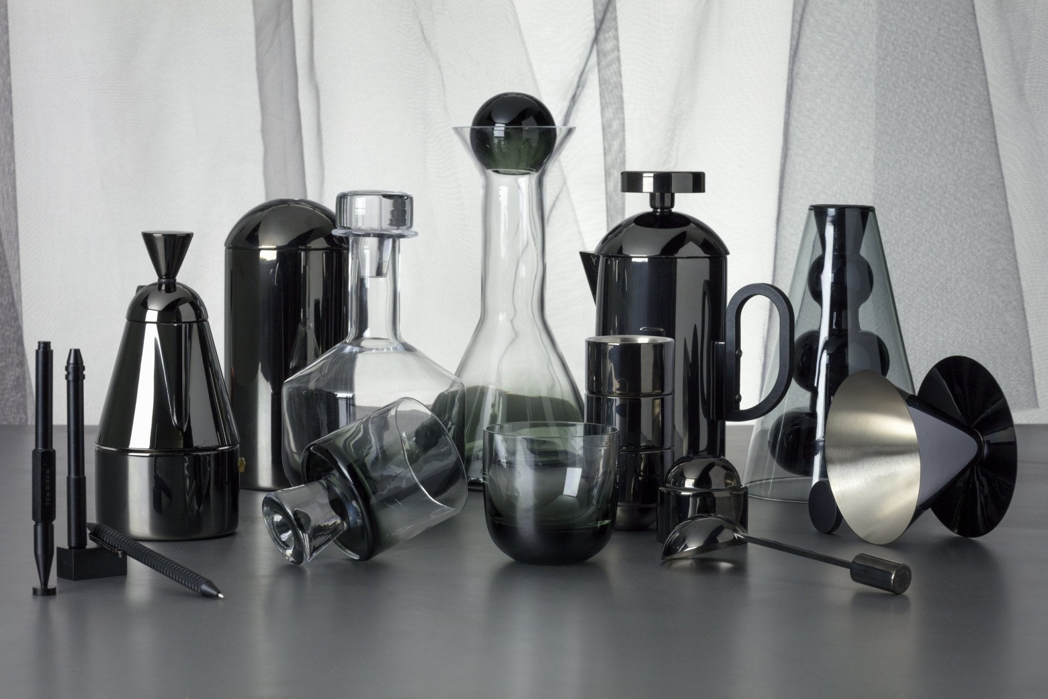 In Black, Tank sets a mysterious and indulgent tone to our glassware collection. Created through a technically demanding fusion of clear and solid black glass, Tank is mouth-blown into the graphic forms for timeless table top architecture.