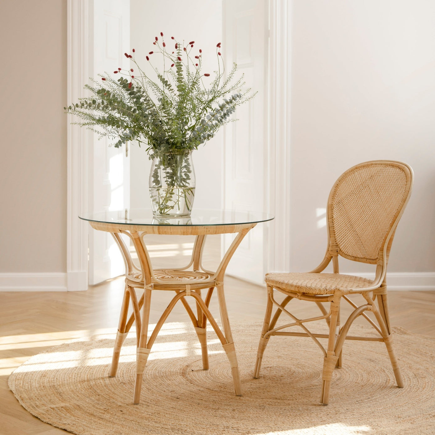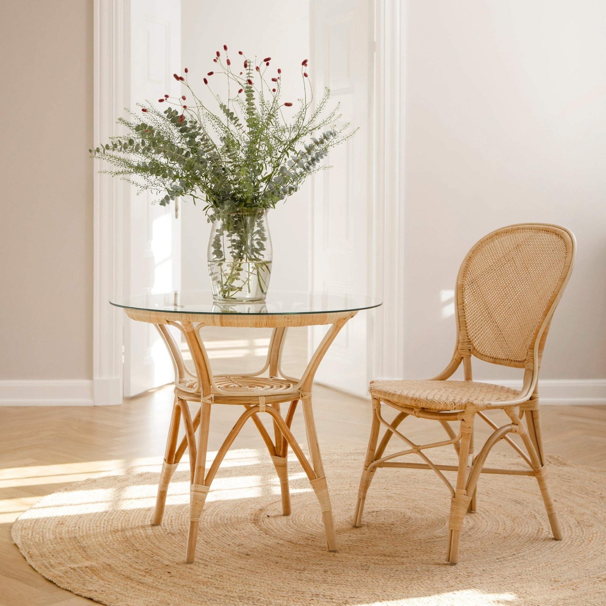 The Tony Cafe Table by Sika Design combines classic Scandinavian style with lasting functionality. Made from natural rattan and tempered glass, it offers a sleek, modern look. The table fits perfectly in dining areas, whether for casual or formal settings. Add a touch of elegance to your home or café with this versatile table, which works beautifully with a variety of chairs.
