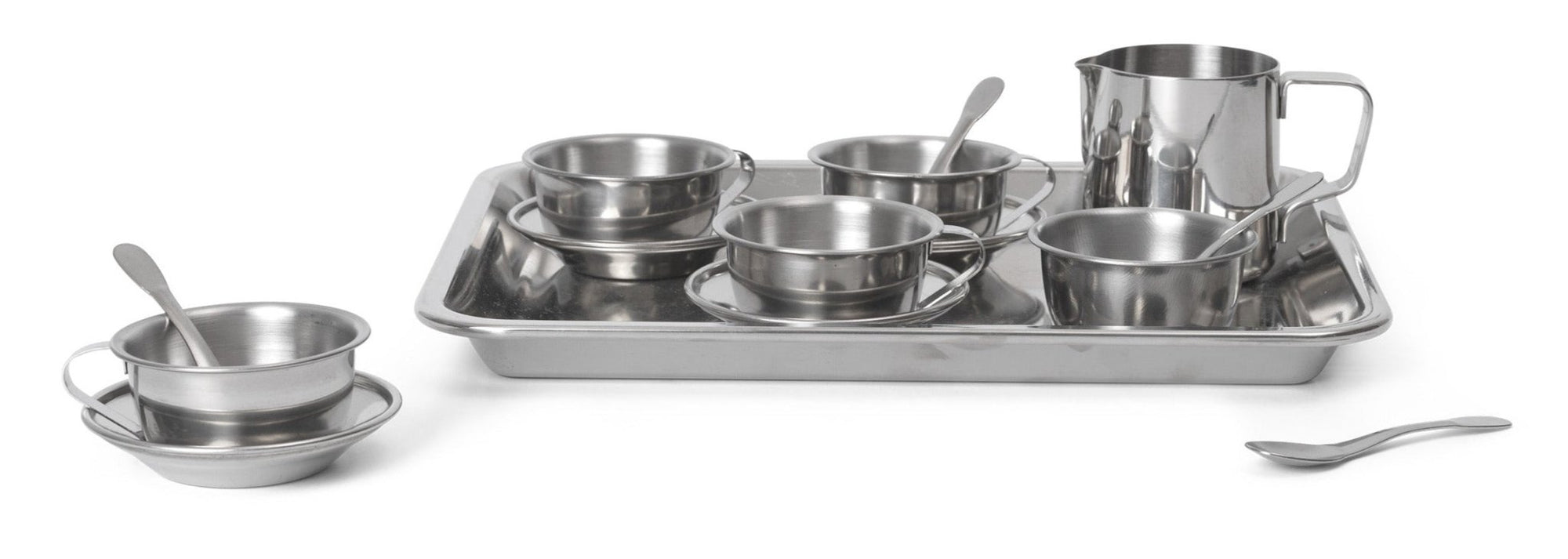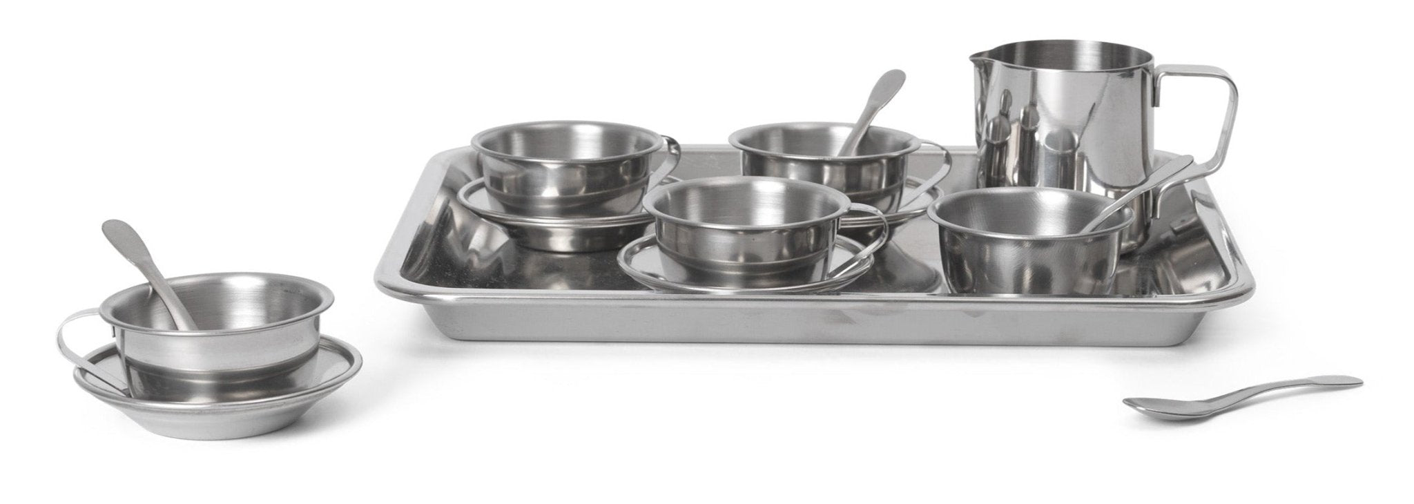 Set the table for a lovely tea party with your little ones using the Toro Play Set. This set includes a tray, 4 cups, 4 saucers, one sugar holder and one milk pitcher, all made from stainless steel. It provides everything you need for an engaging and creative playtime. The materials used are durable and easy to clean, and they have a sleek and elegant design that complements any kids' room.