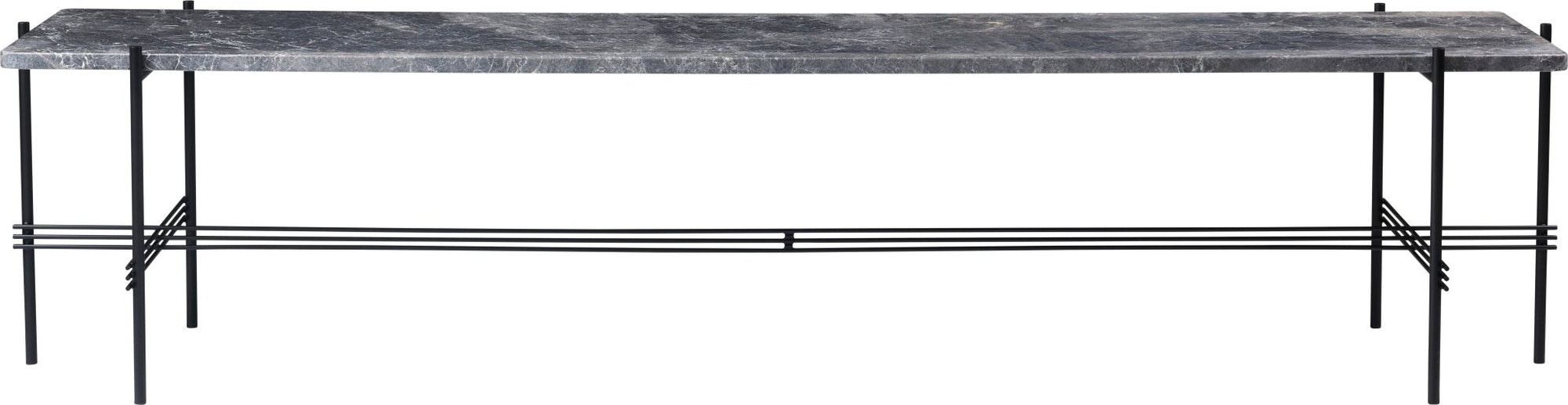 Build your modern living space around the TS Console, working with its metal and marble elements to create a sleek, modern, stoical living room. A dynamic tabletop of Black Marquina, Grey Emperador, or White Carrara marble hovers above the thin, metal, crosshatched legs. The silhouette, though modest, achieves movement within the overall indomitable presence of this modern Gubi console table.