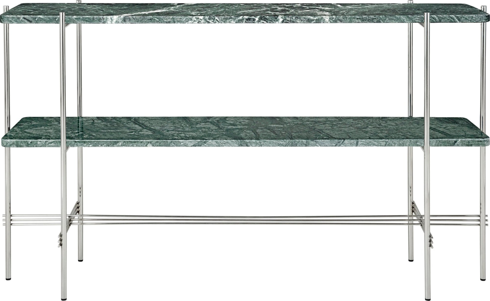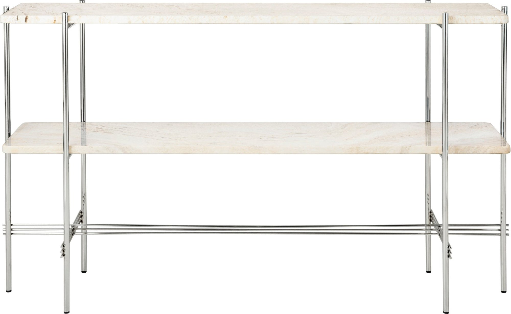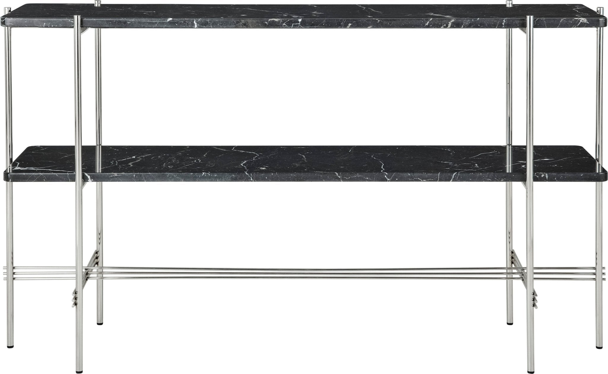 Build your modern living space around the TS Console with 2 Racks, working with its metal and marble elements to create a sleek, modern, stoical living room. A dynamic tabletop of Marquina, Guatemala, Travertine, or Carrara marble hovers above a second marble shelf, forming a two-tier shelving system, all supported by thin, crosshatched legs. The silhouette, though modest, achieves movement within the overall indomitable presence of this modern Gubi console table.