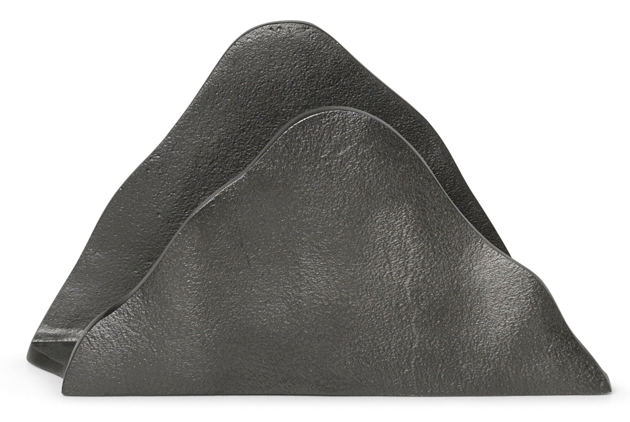 Named after the Japanese word for mountain, the Yama Holder is a sculptural yet functional piece that is inspired by wild, untamed landscape. Made from recycled casted aluminum and featuring a rough, matte and blackened finish that contrasts its fluid and organic silhouette, the decorative holder can be used in the kitchen or dining room for storing napkins or in your home office for papers, letters and notes.